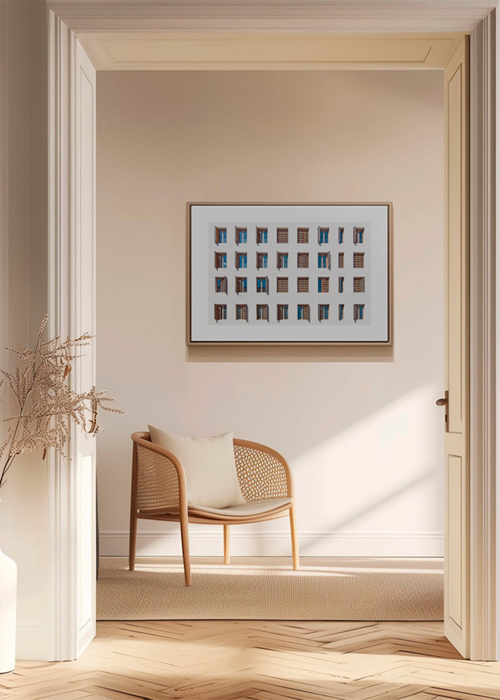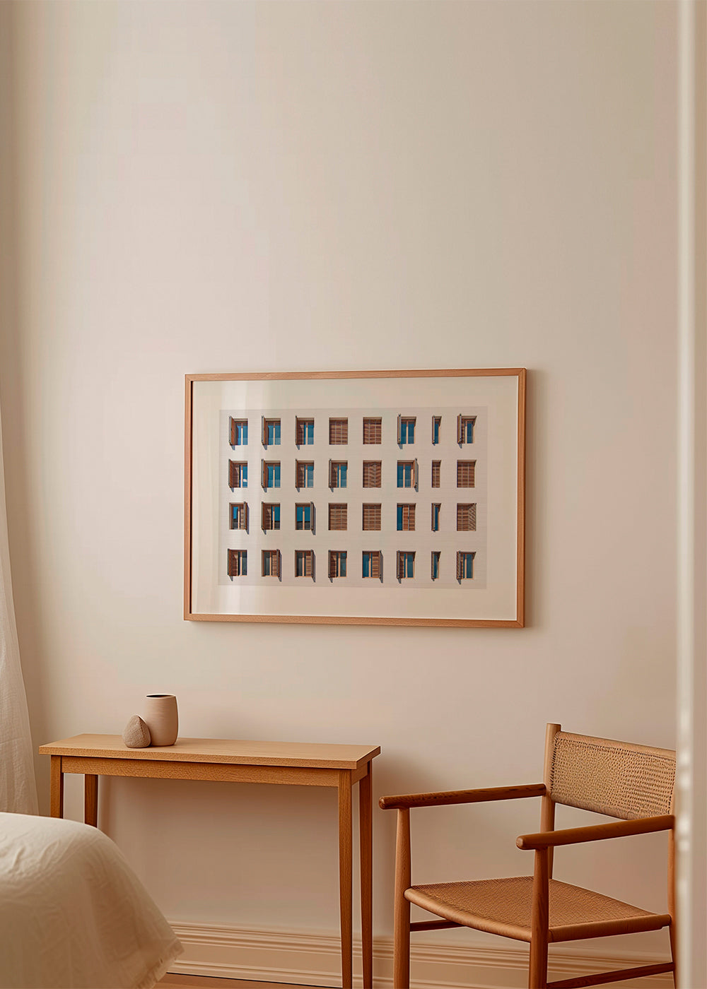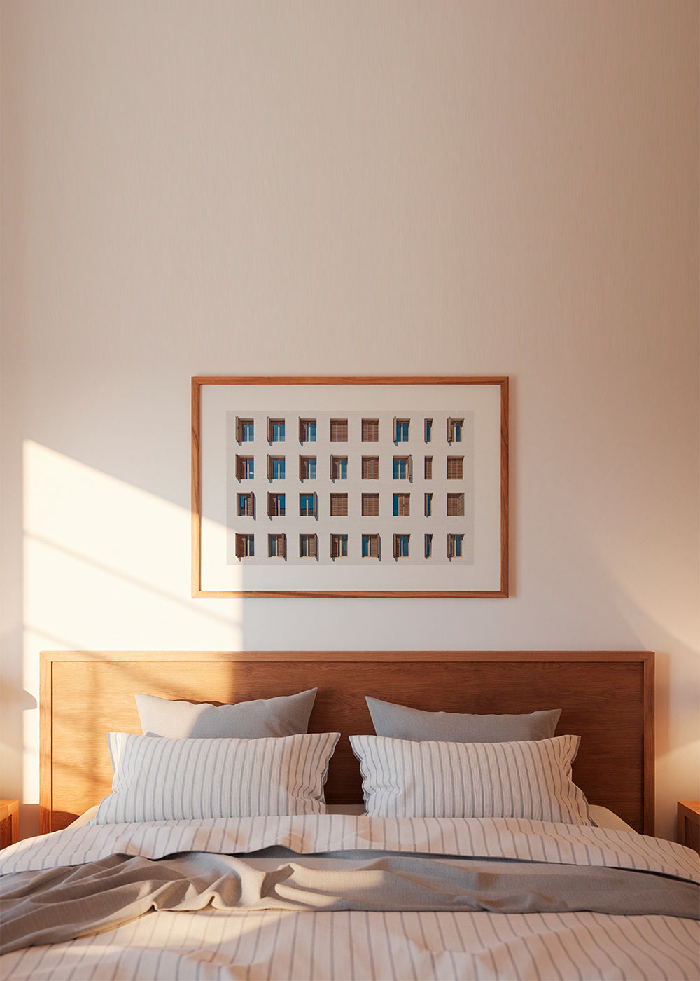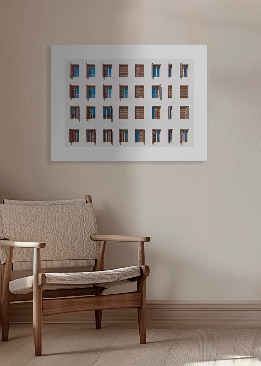 We work with solid wood and aluminium frames. All framed artworks are shipped already assembled and ready to hang. The front protection is made of high-clarity acrylic glass.