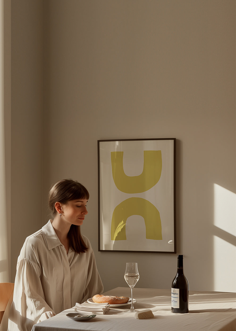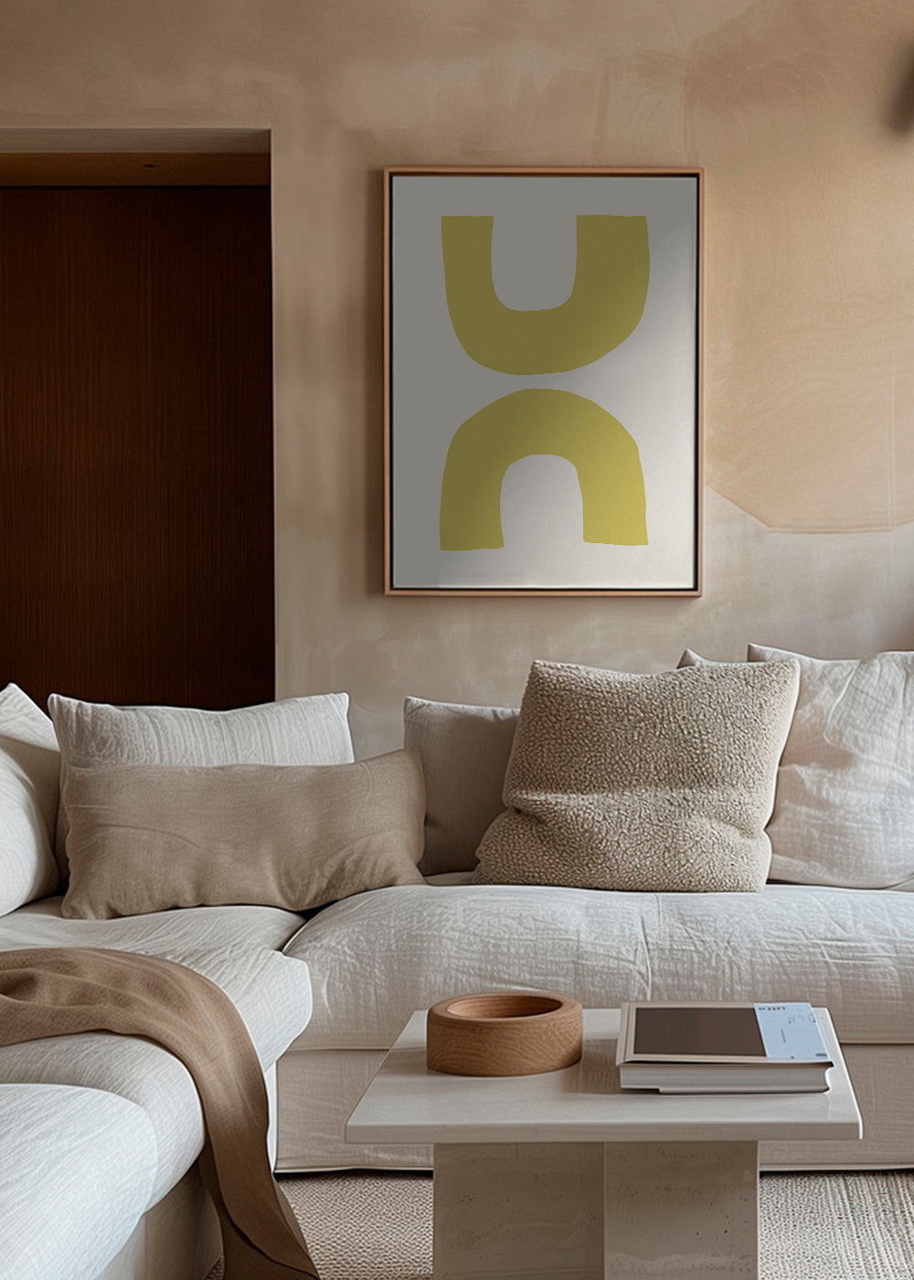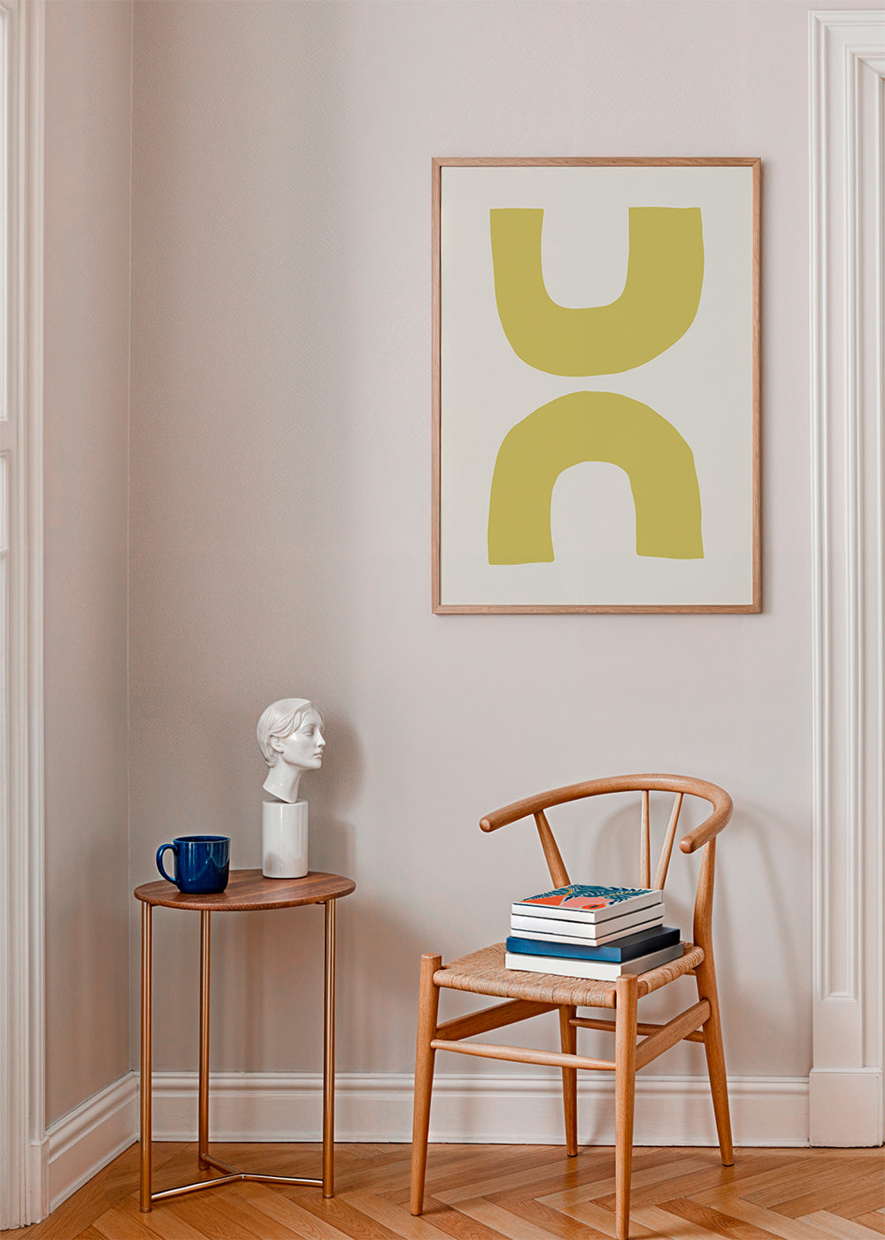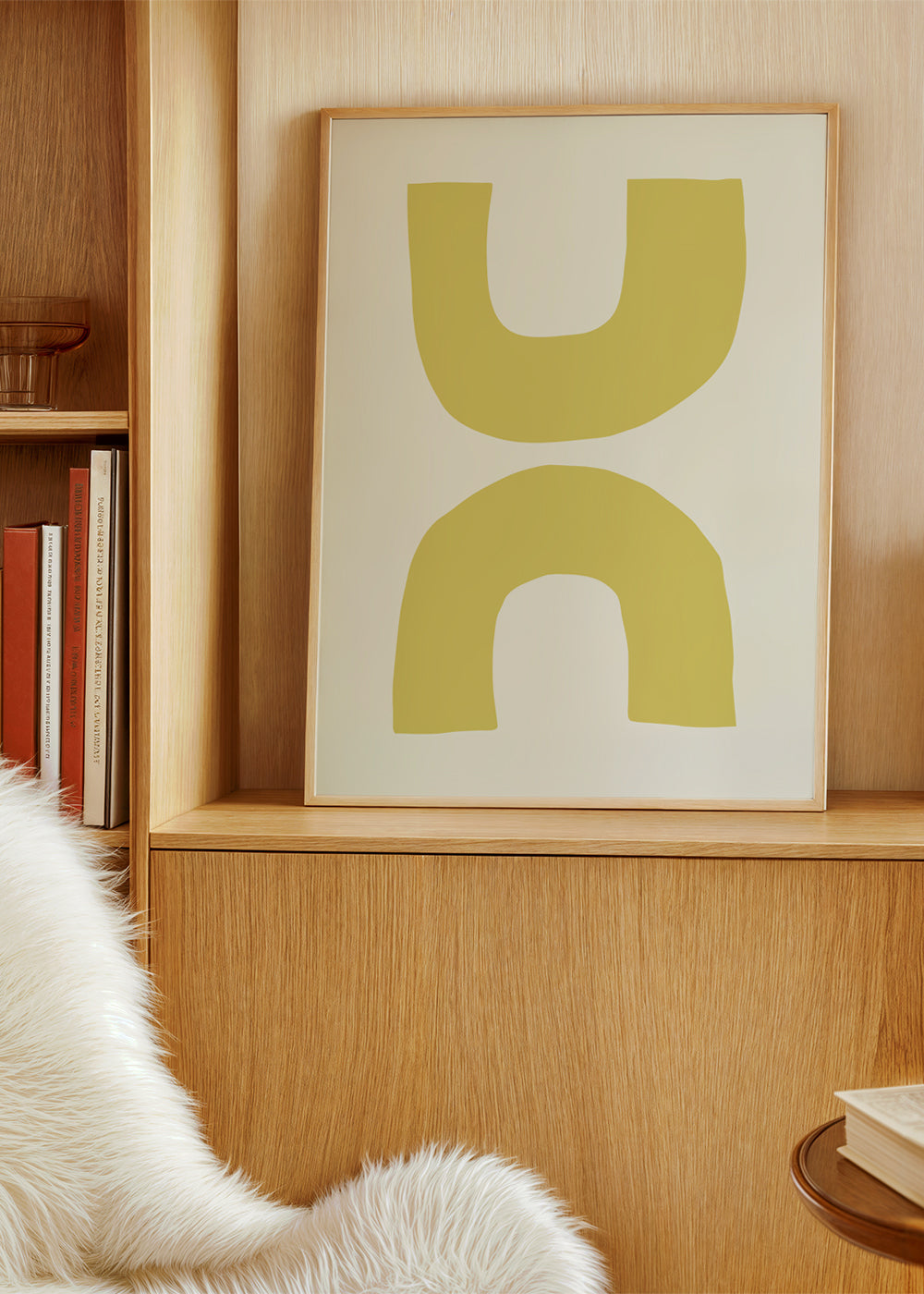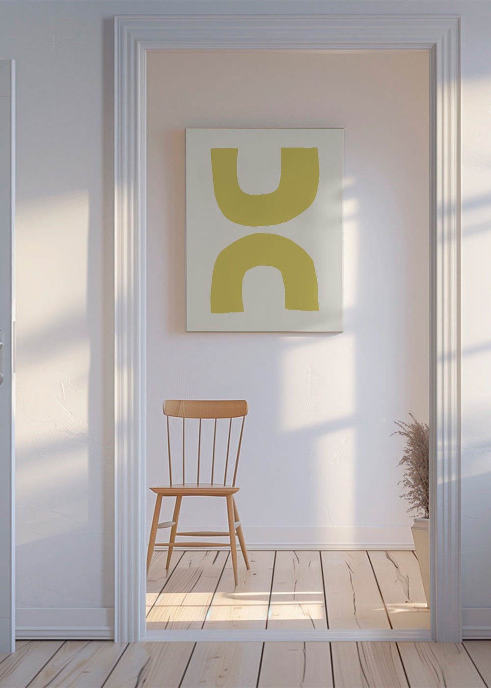 A poster from the geometric wall art and prints series, made by Nouveau Prints, with yellow, and to hang in vertical position. The abstract, geometric shapes help create a casual, creative setting. Your home decor is in your hands.