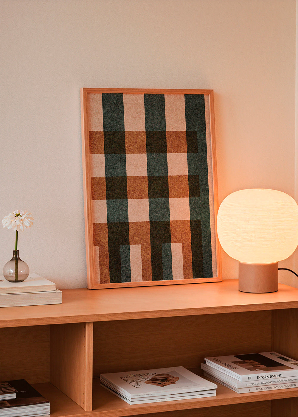 A poster in the style of our geometric wall art and prints, made by Daniel Coulmann, with tones of green, and with vertical layout. The abstract, geometric shapes help create a casual, creative setting. Refresh a whole room by just adding a few posters on the walls.