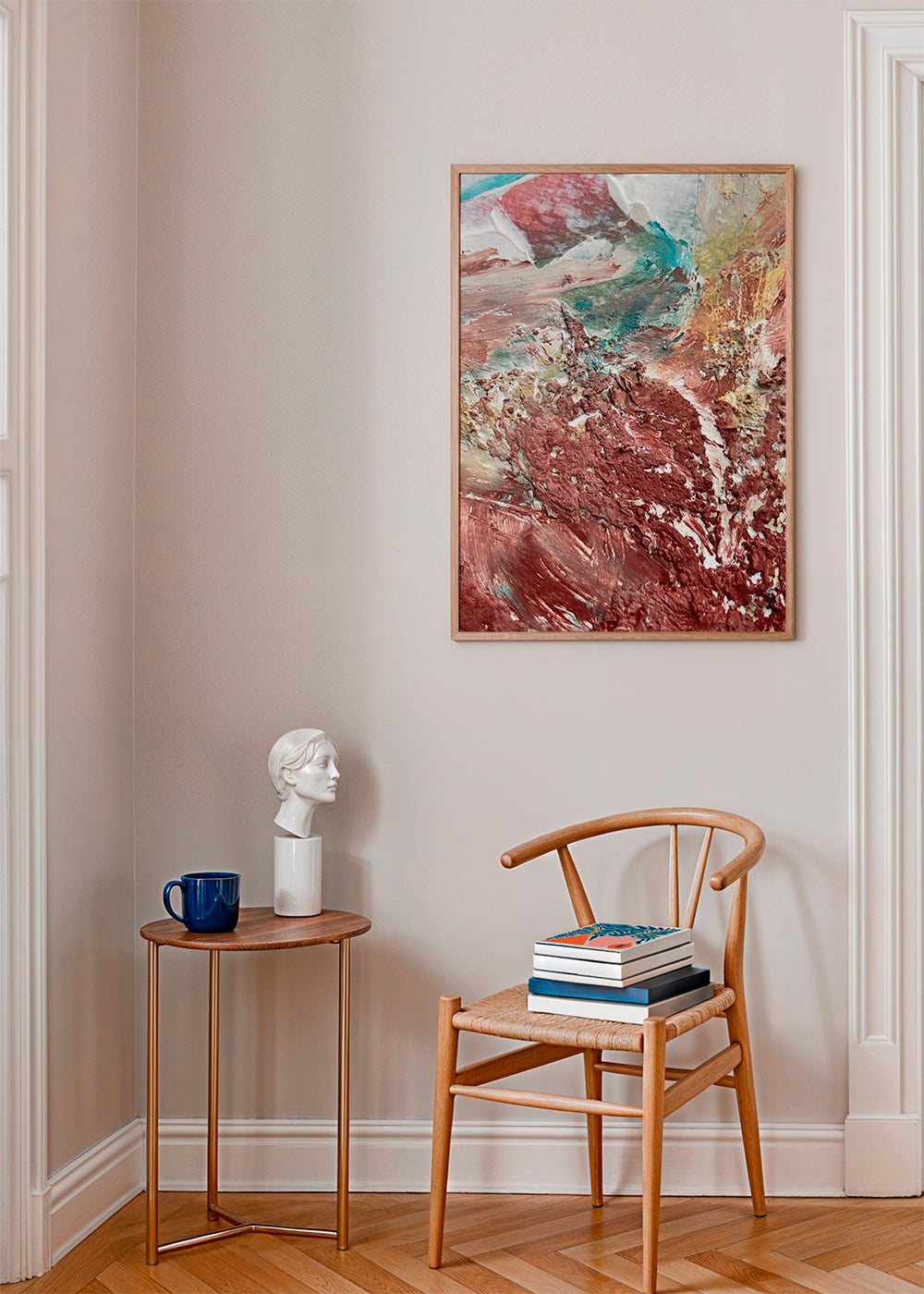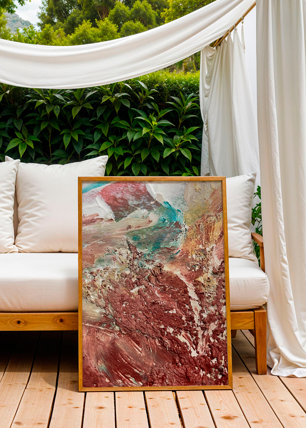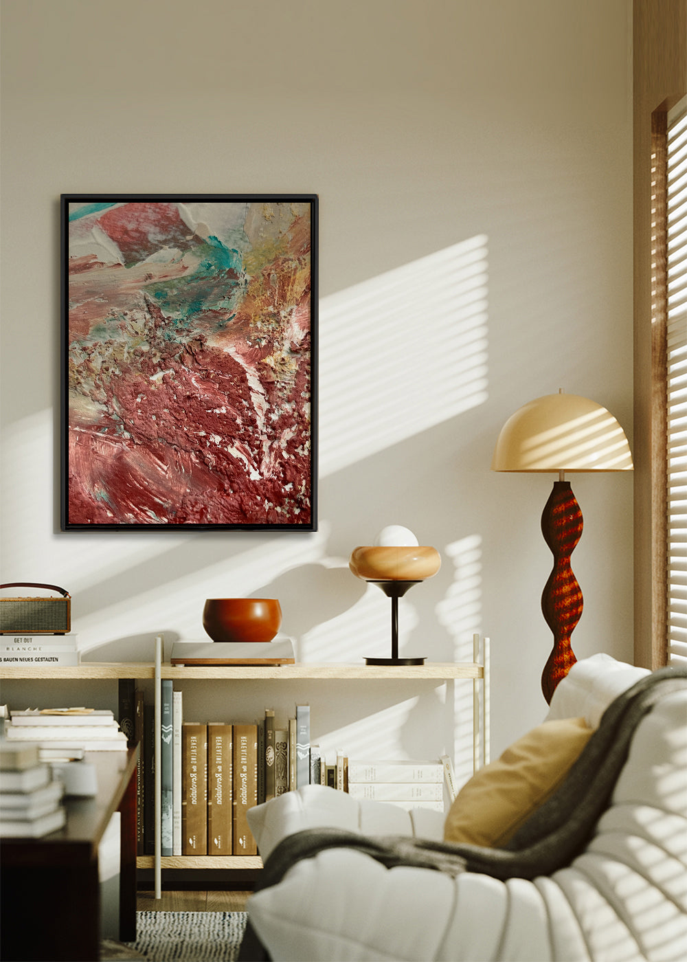 A print from the abstract wall art and prints series, by the artist Elena Camacho Art, with red pigments, and with vertical layout. If you want to add some style and originality to your decor, this abstract design will help give a cutting-edge touch to the walls of your home. A modern touch for your home.
