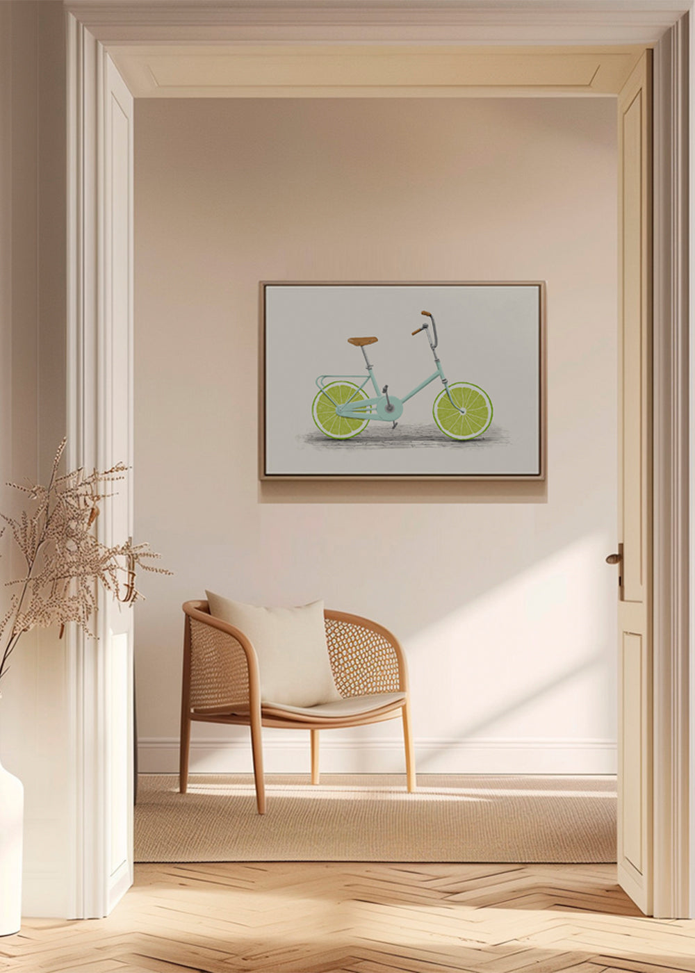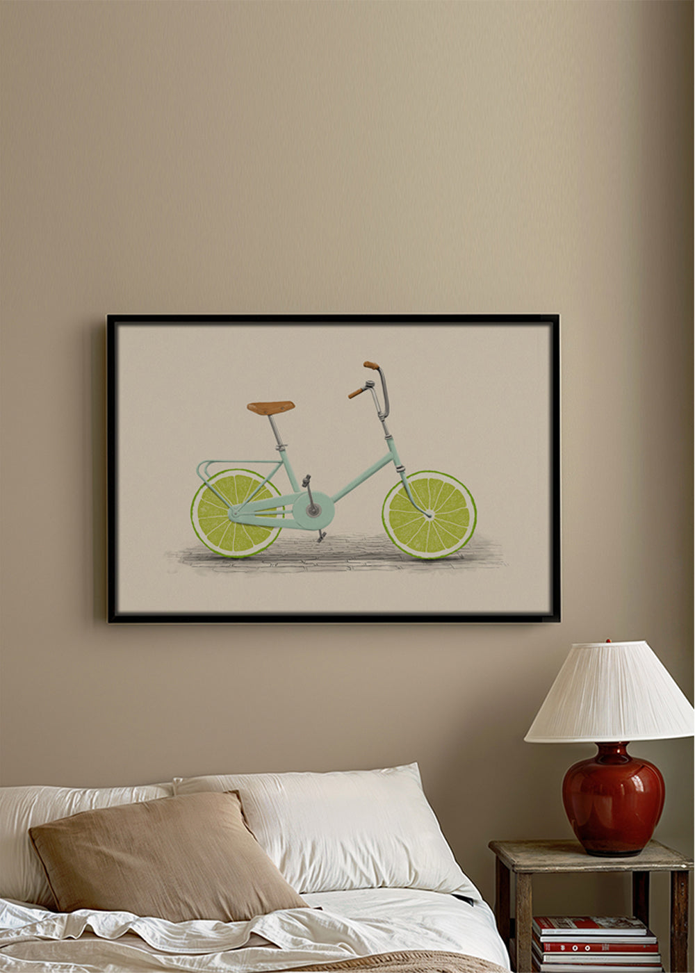 This print from our bicycle wall art series, by Florent Bodart, with shades of blue, and horizontal layout. Give your style a vintage touch by pairing this print with other retro-style posters. A modern touch for your home.