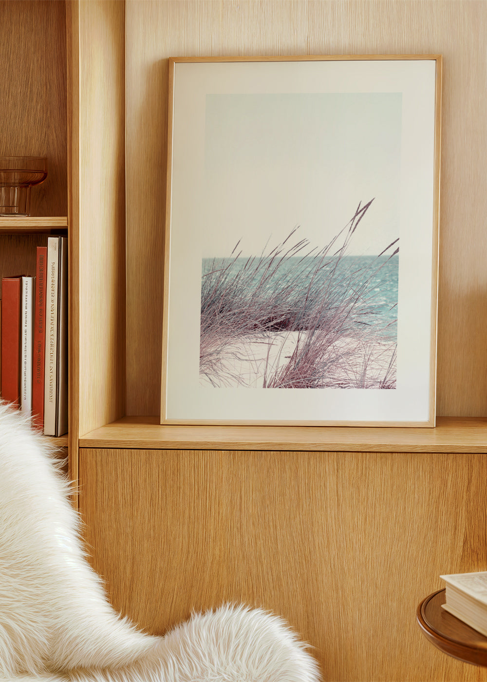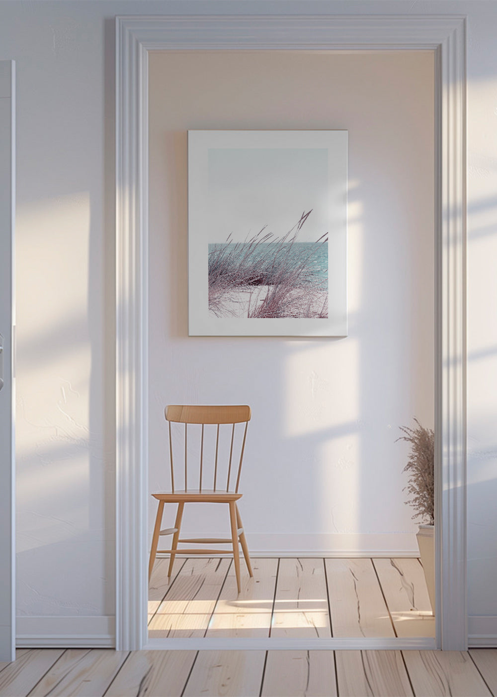 A design from the travel posters category, in tones of blue, and with vertical layout. The tranquillity and freedom of landscape prints is one of a kind. Forget about boring walls. This design includes a white strip around it to add contrast to the piece.