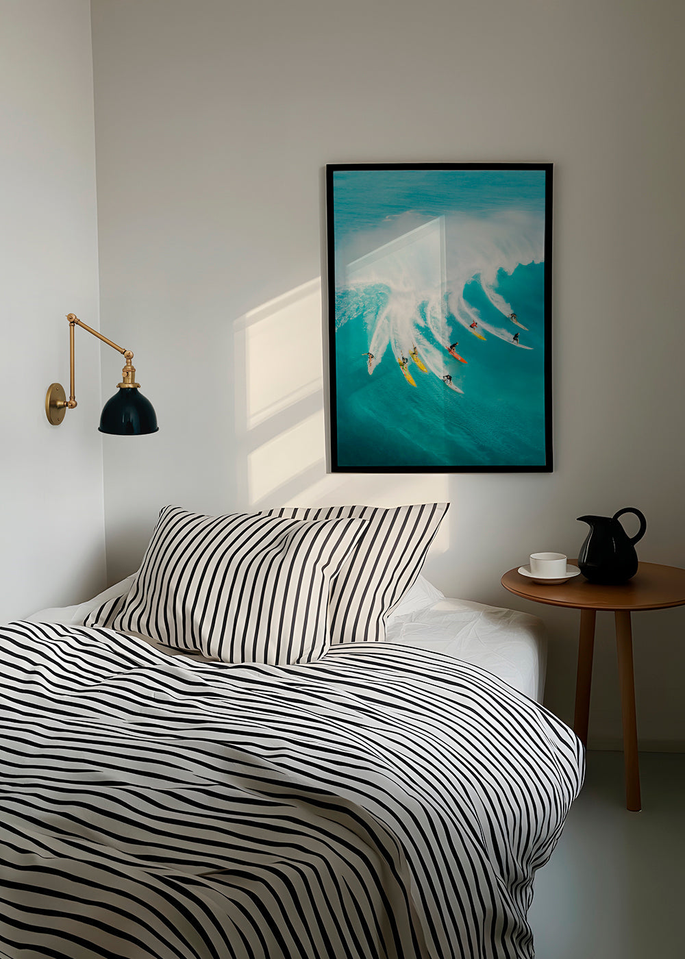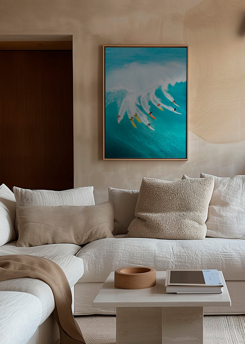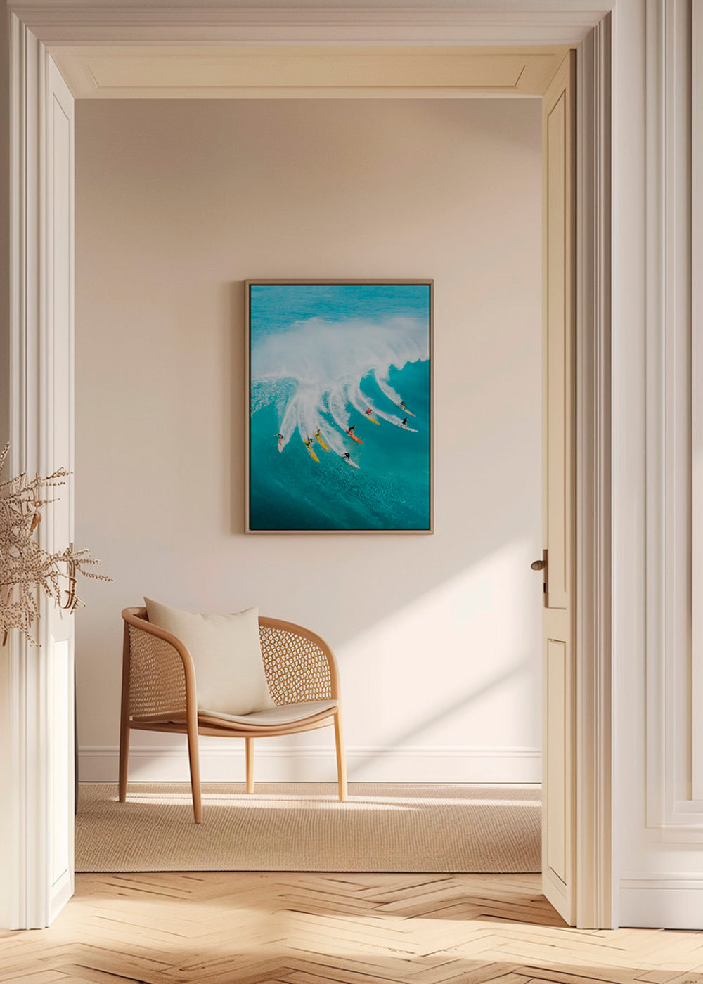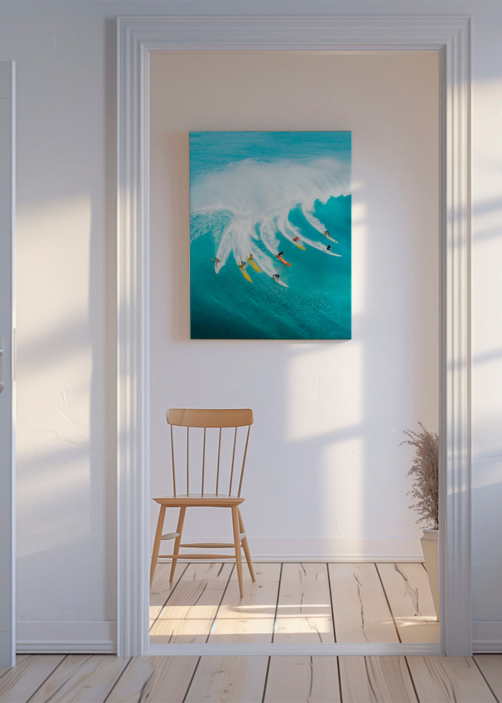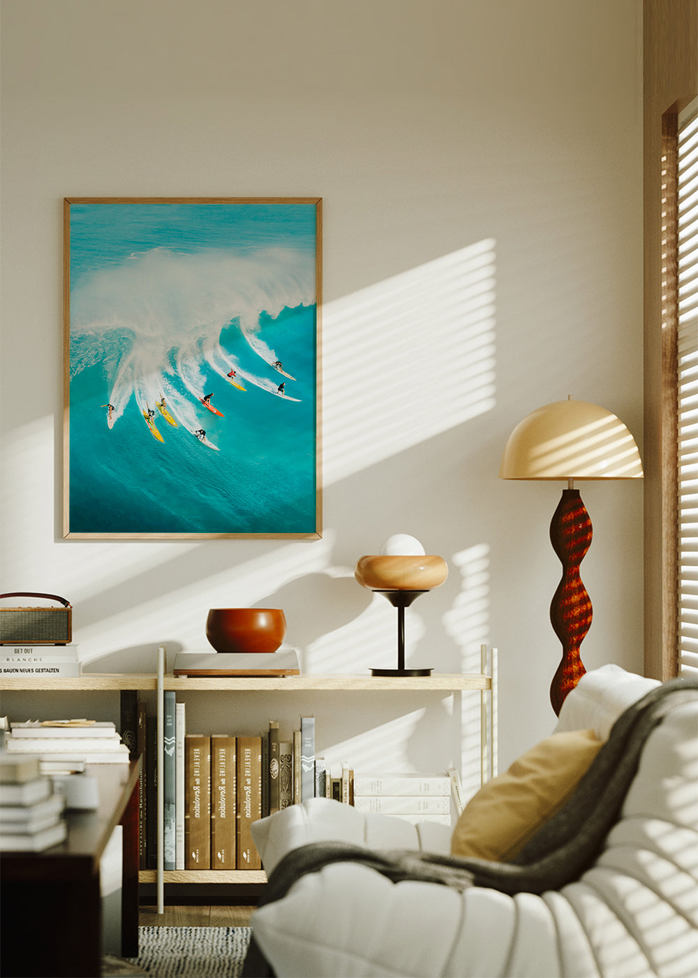 Beautiful piece in the style of our surf posters and wall art, by Gal Design, in tones of blue, and vertical layout. Landscape decoration brings a breath of fresh air to any room. A new look on your walls can bring a breath of fresh air to all your decor.