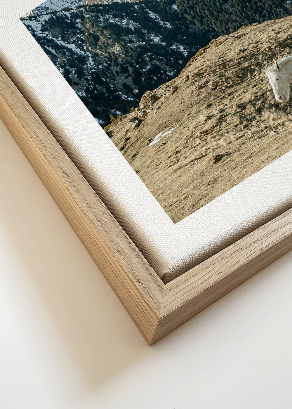 We work with solid wood and aluminium frames. All framed artworks are shipped already assembled and ready to hang. The front protection is made of high-clarity acrylic glass.