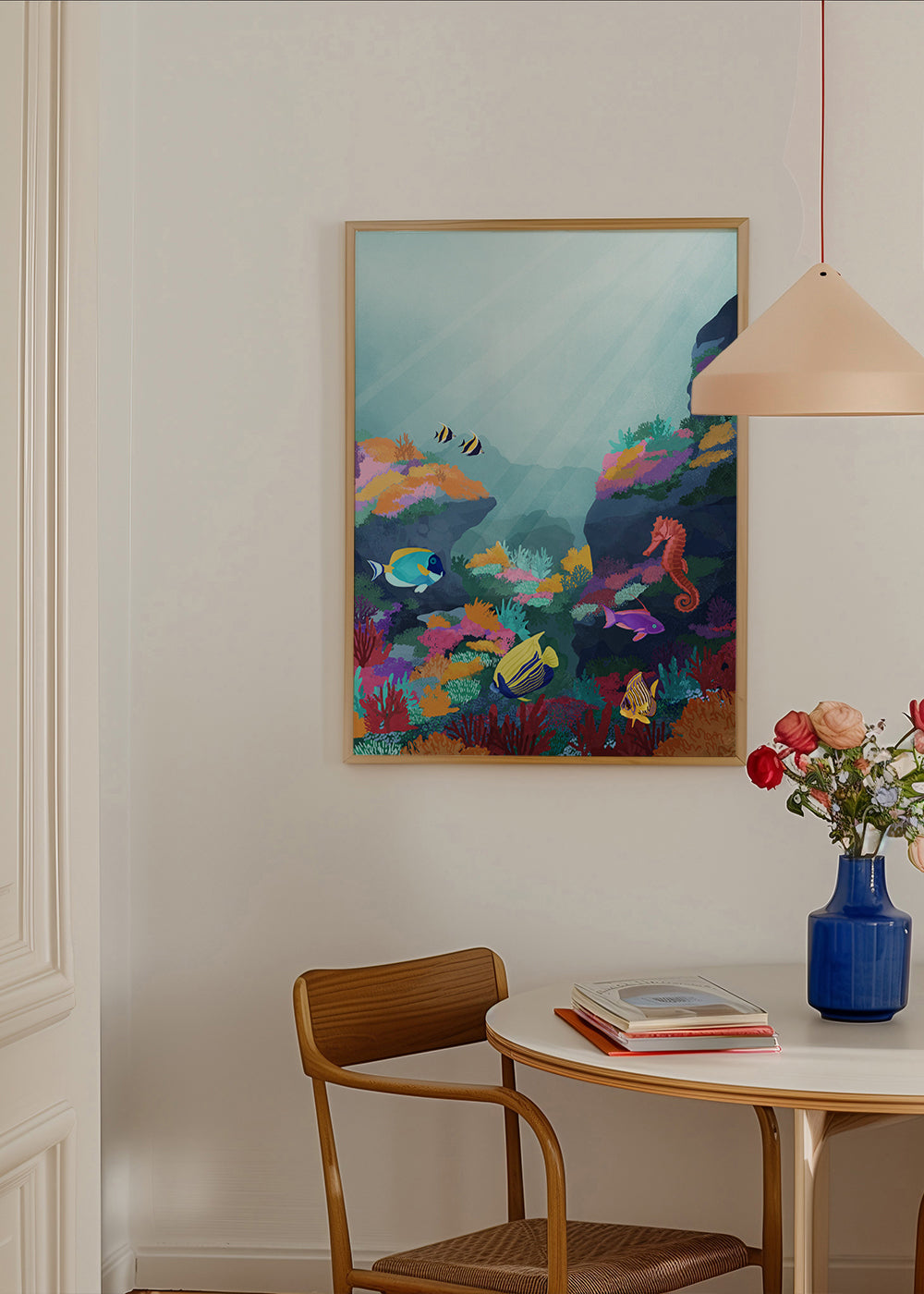 A print inspired by the collection of animal wall art, an original by Goed Blauw, with touches of multicolor, and facing vertically. Decorating with animal prints is a great way to make your walls more energetic. Forget about boring walls.