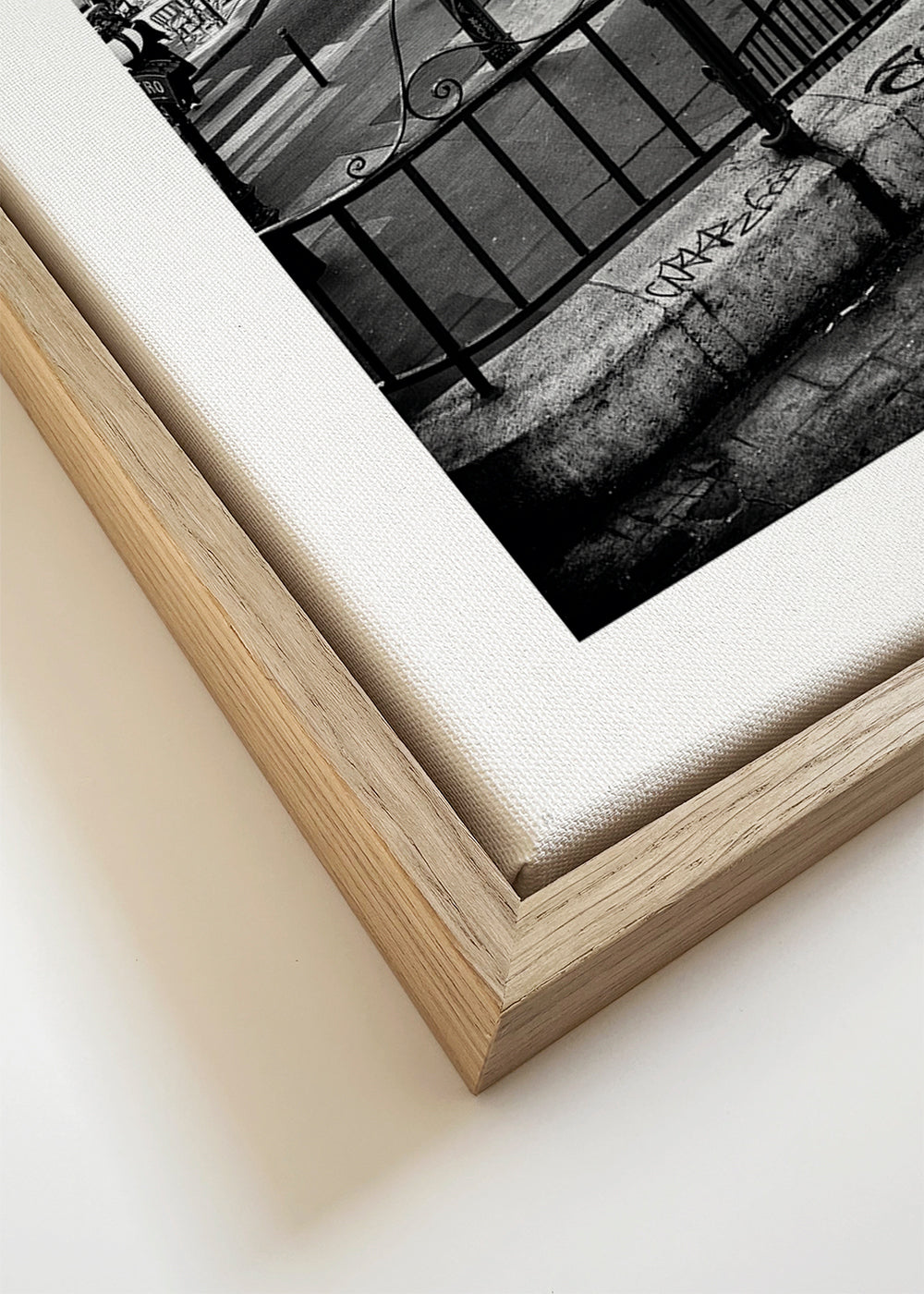 If you select the passepartout option, we will add the white matt board to the frame, and we will reduce the design of the work. For example, if you select a print size 20x28 in, with an oak colored frame and passepartout, we will reduce the design of the print to the previous size (16x20 in). In this way, it will adapt perfectly to the inside window of the passepartout.