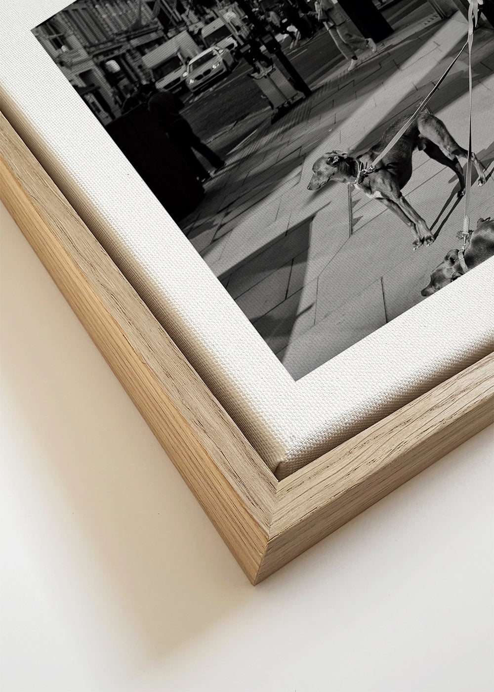 If you select the passepartout option, we will add the white matt board to the frame, and we will reduce the design of the work. For example, if you select a print size 20x28 in, with an oak colored frame and passepartout, we will reduce the design of the print to the previous size (16x20 in). In this way, it will adapt perfectly to the inside window of the passepartout.