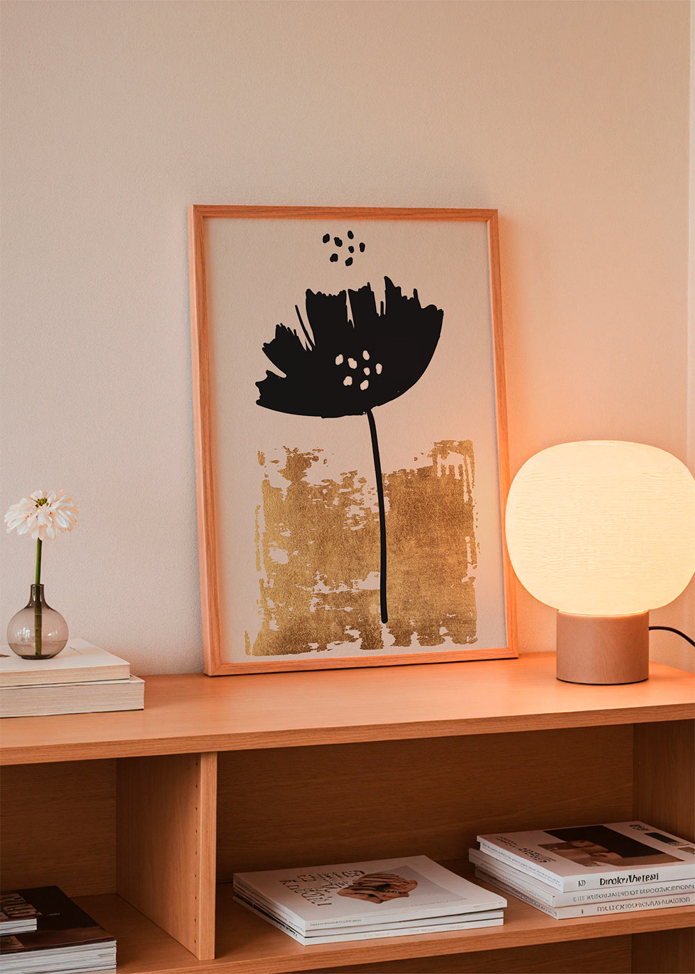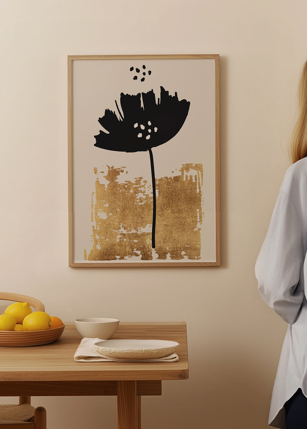 This print from our repertoire of palm tree prints, from the mind of KUBISTIKA, with tones of gold, and facing vertically. Prints with flowers and plants bring freshness to your home decor. Let art flood your home.