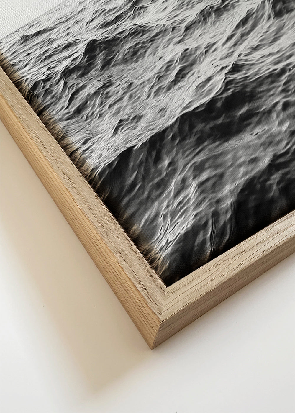 We work with solid wood and aluminium frames. All framed artworks are shipped already assembled and ready to hang. The front protection is made of high-clarity acrylic glass.
