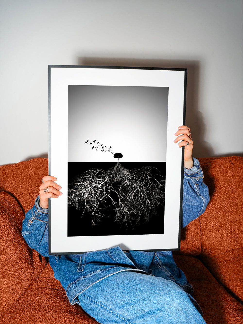 A poster from our repertoire of cactus wall art, with black and white pigments, and with vertical layout. Peace, calmness, tranquillity... Join the mindfulness decoration movement with this design. Fill your decoration with art. The white strip around the piece enhances its expressiveness.