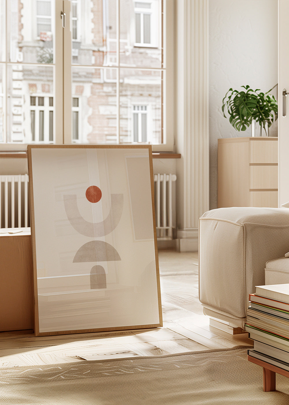 A piece from the geometric wall art and prints category, created by Kookie Pixel, with red pigments, and facing vertically. The abstract, geometric shapes help create a casual, creative setting. Transform your spaces with art.