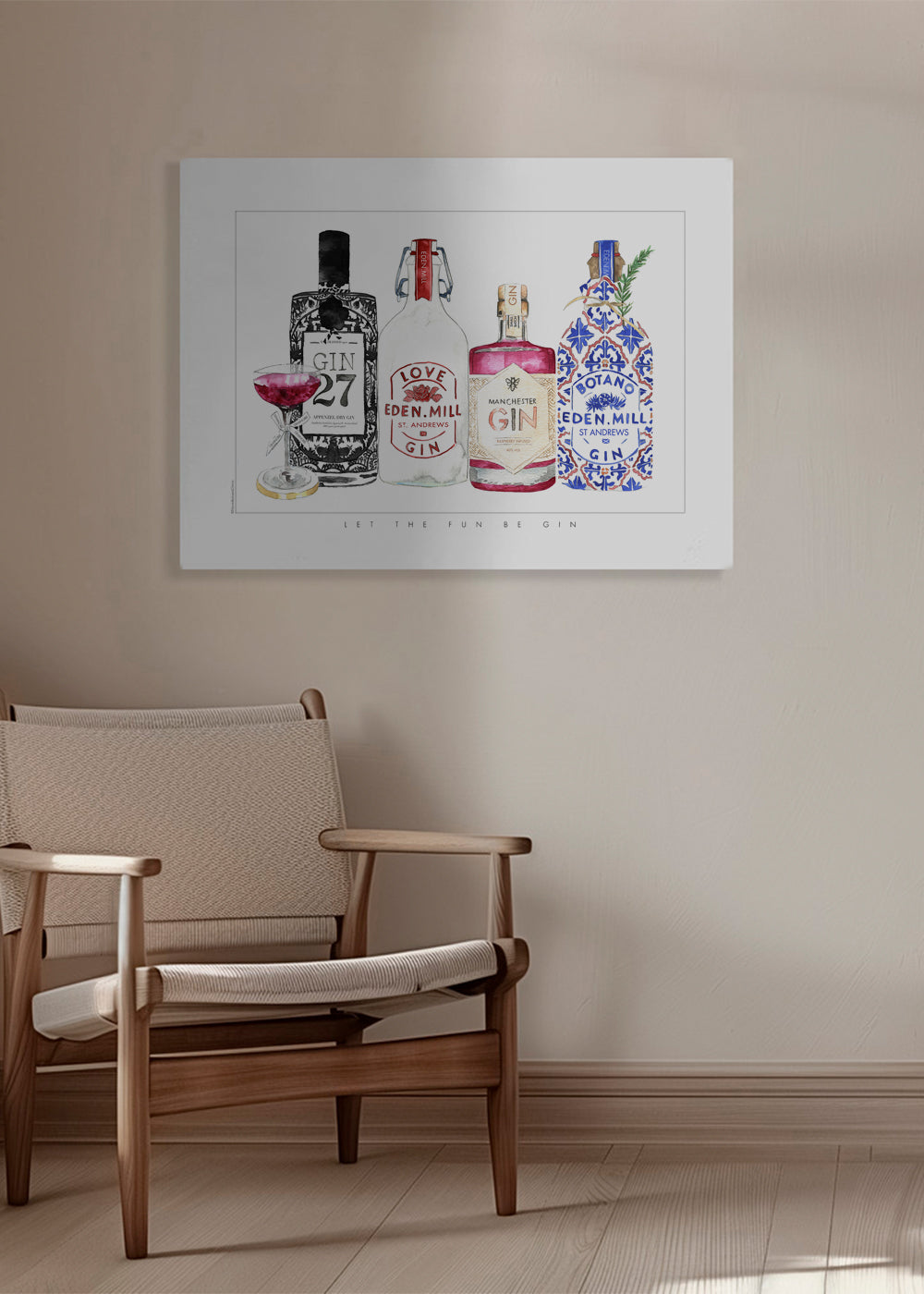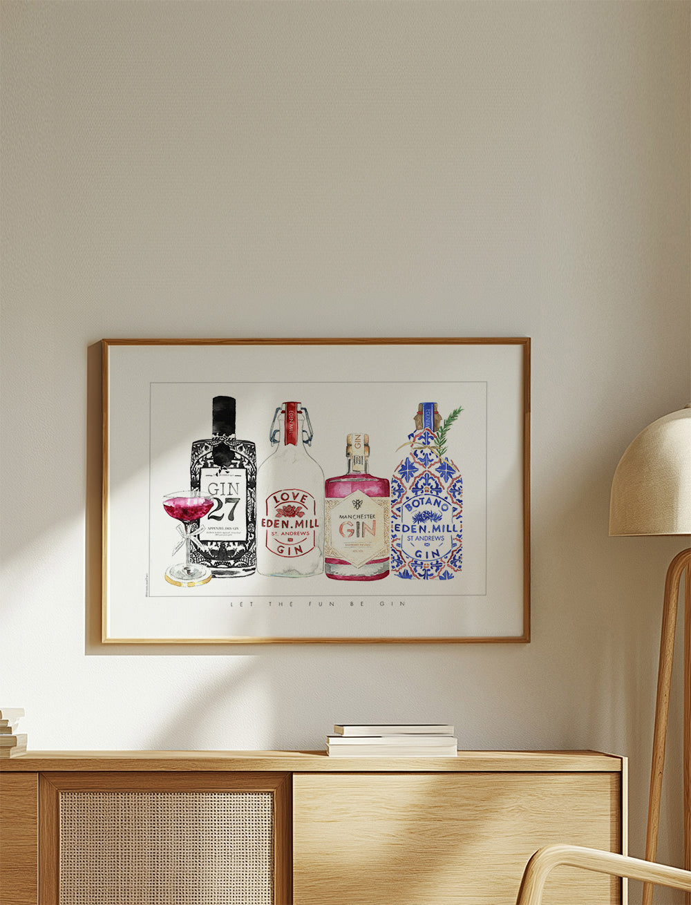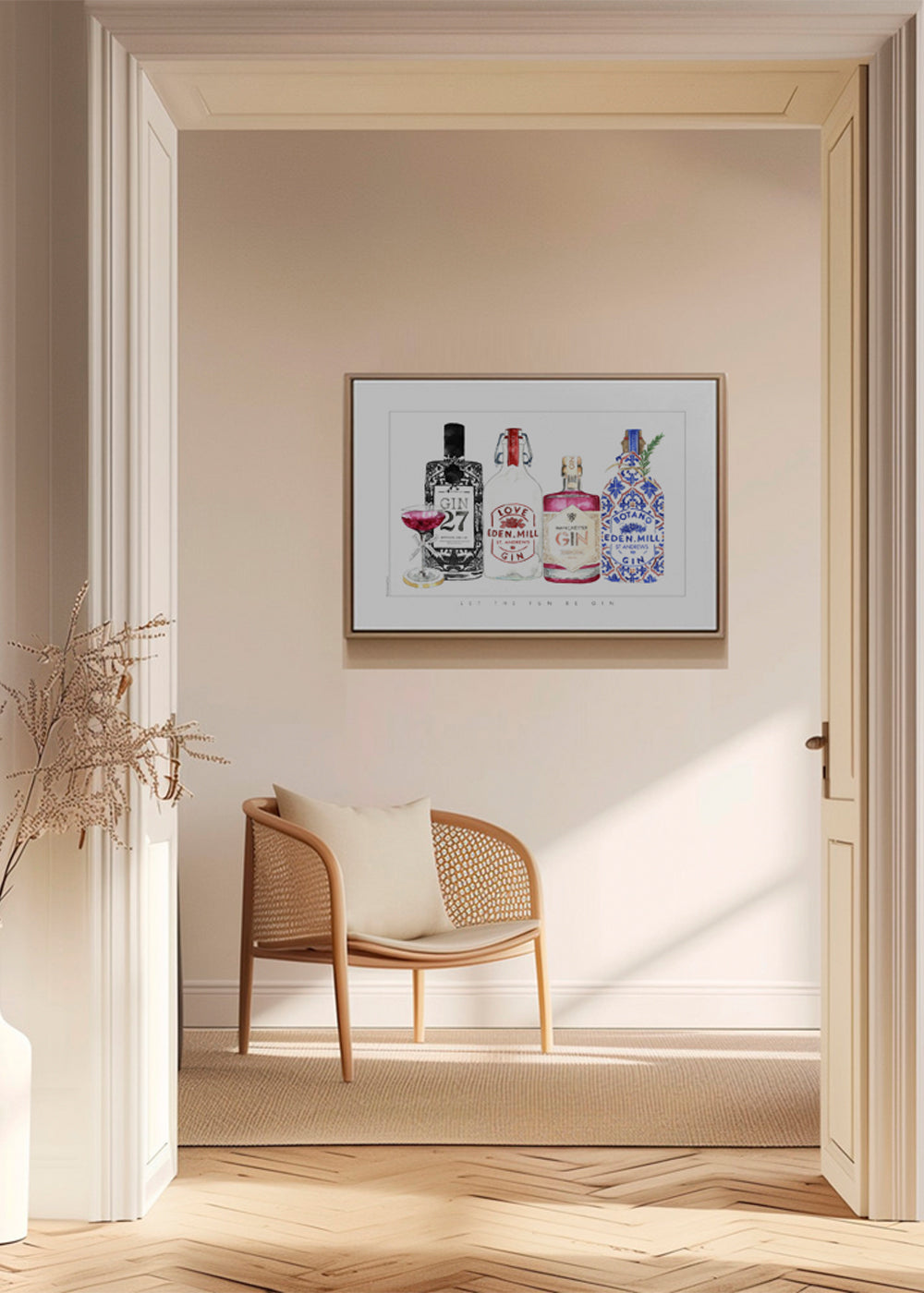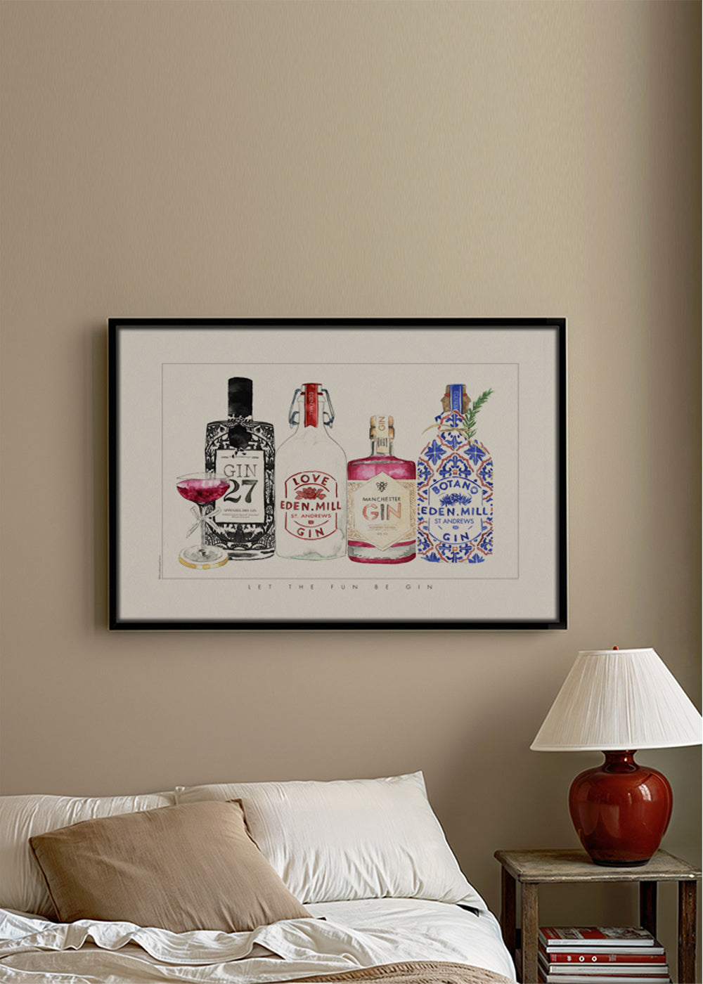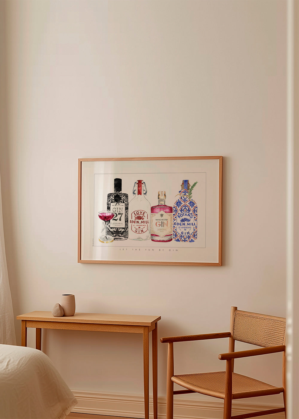 A poster in the style of our gin wall art, by Mercedes Lopez Charro, with touches of multicolor, and with horizontal layout. A beautiful landscape perfect for pairing with other nature prints. Create a one-of-a-kind spot.