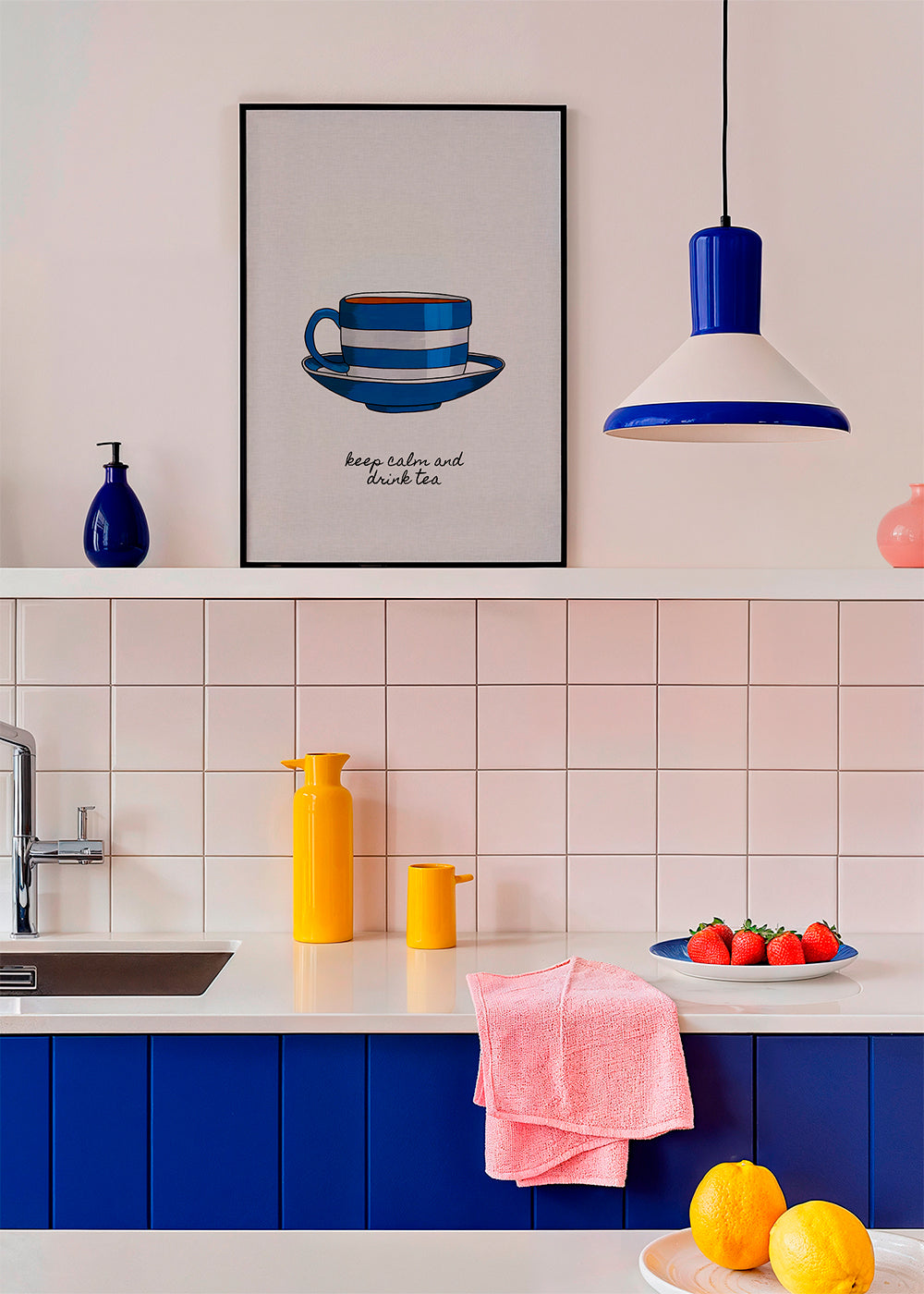 Beautiful poster in the style of our coffee wall art, by Orara Studio, in blue shades, and in vertical position. Prints for the kitchen are a perfect decorative element for such a cosy space. Fresh and original.