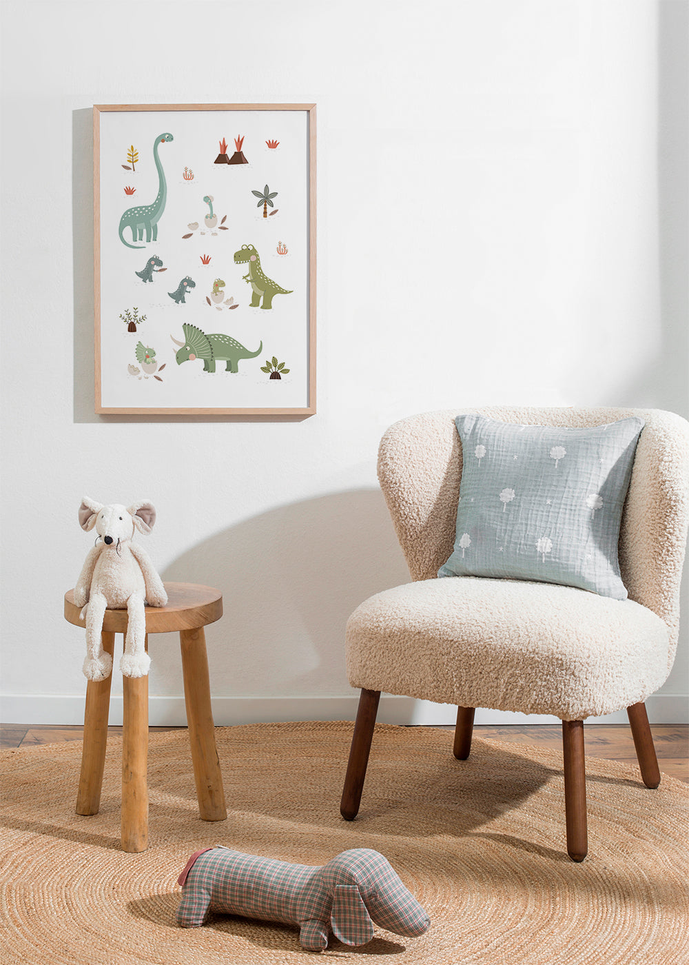 This poster from our dinosaurs prints collection, by Marta Munte, with touches of green, and to hang in vertical position. Animal prints let you show your wild side through your wall decoration. Create special spaces.
