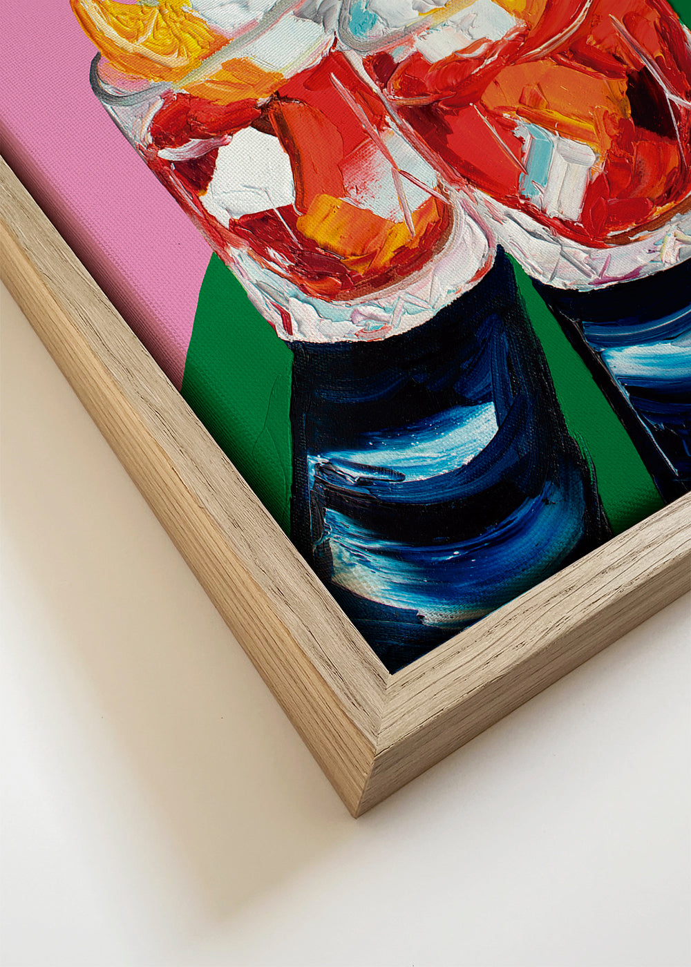 We work with solid wood and aluminium frames. All framed artworks are shipped already assembled and ready to hang. The front protection is made of high-clarity acrylic glass.