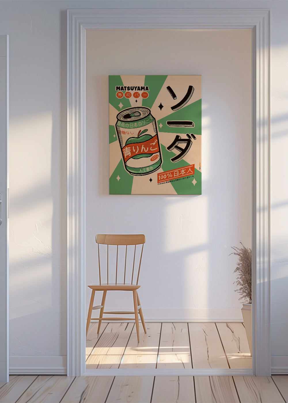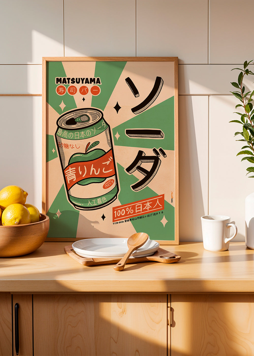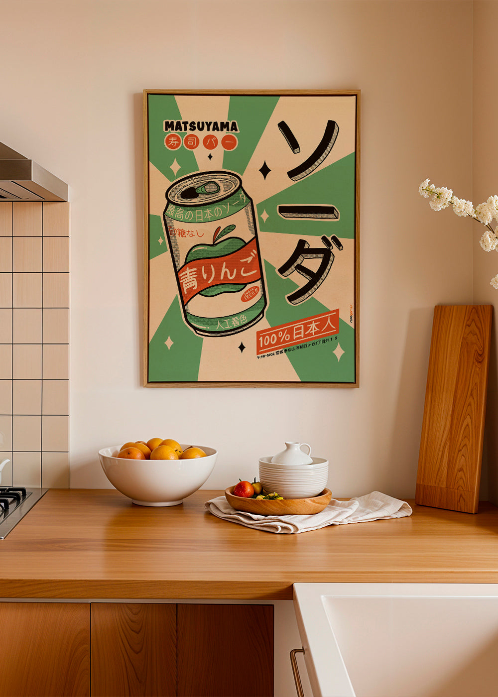 A print from our japanese wall art collection, from the collection of the artist Rafa Gomes, with shades of green, and perfect to hang vertically. A retro poster you can pair with other vintage-style prints for an original touch in the home. Forget about boring walls.