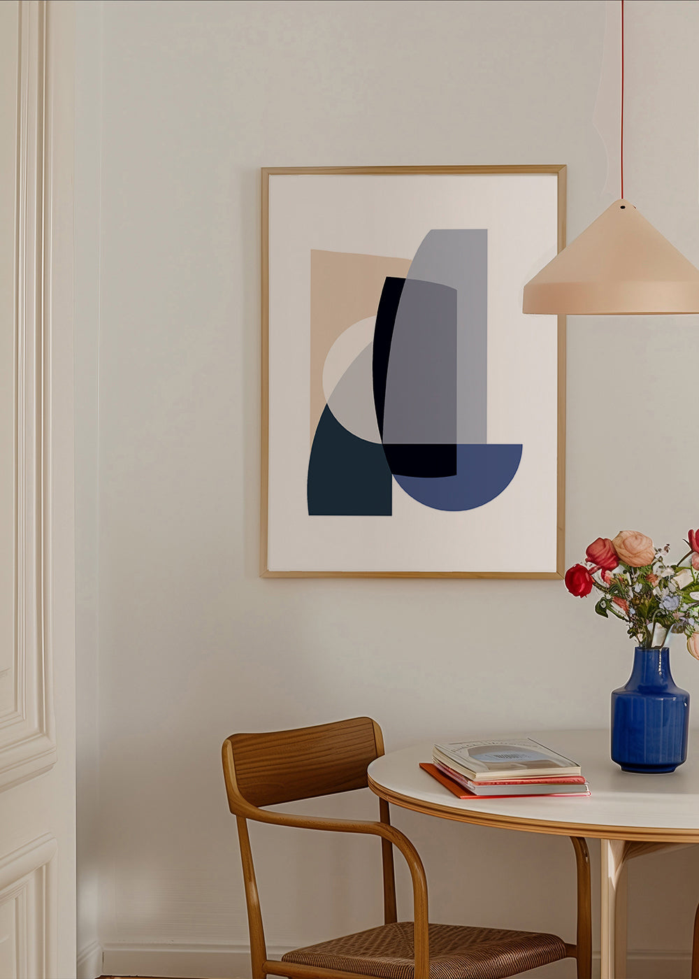 A print from the geometric wall art and prints category, created by Anna Mainz, in tones of blue, and to hang in vertical position. Geometric art is an elegant style to decorate the walls of your home with. Refresh a whole room by just adding a few posters on the walls.