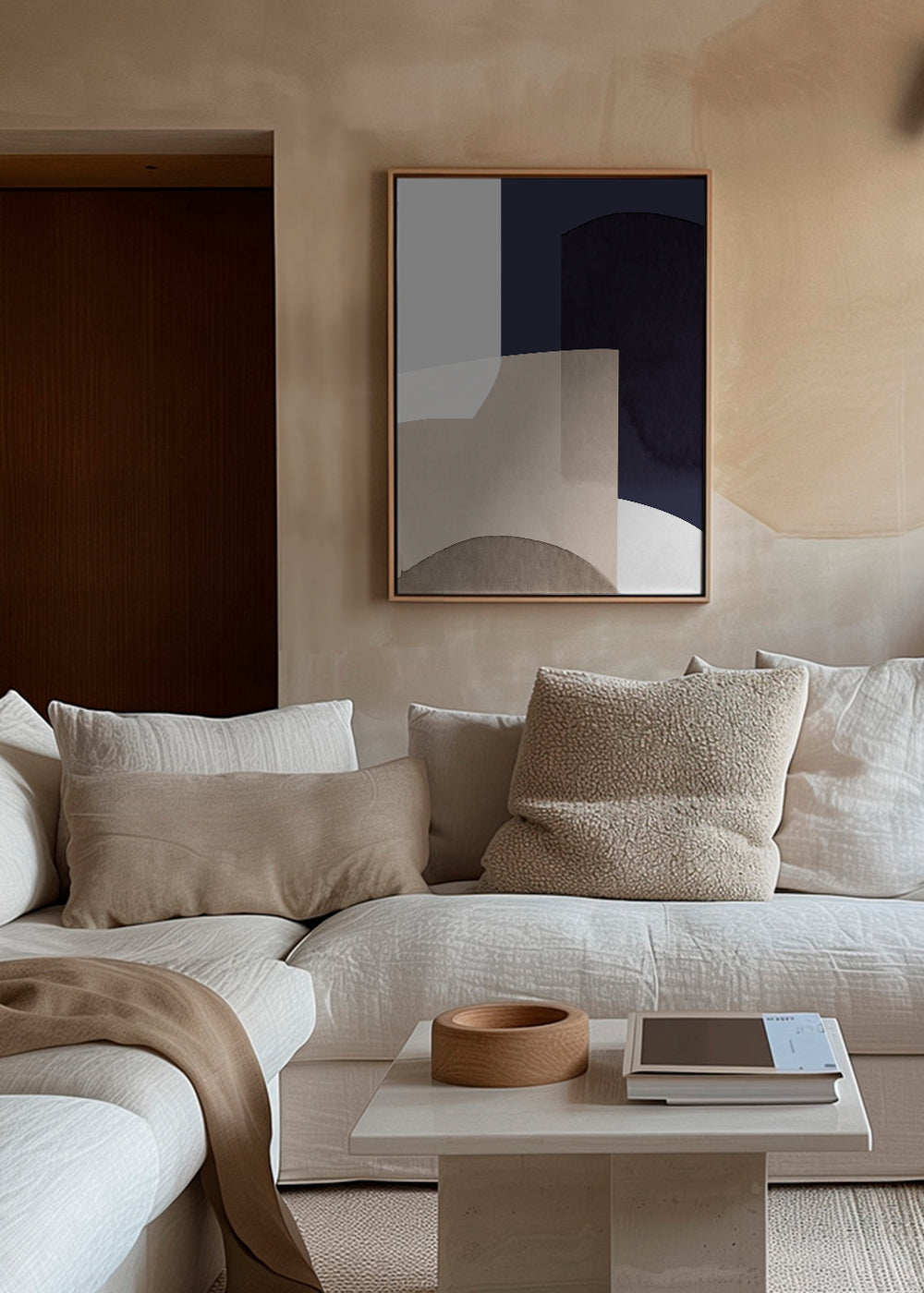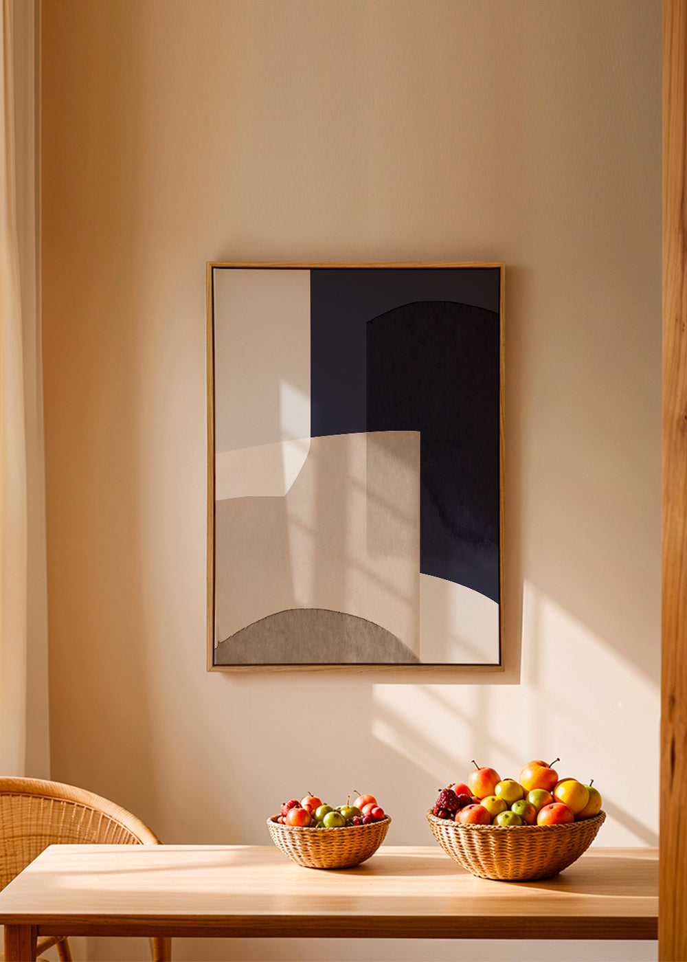 A design from our geometric wall art and prints series, created by Anna Mainz, in blue shades, and vertical layout. This piece with abstract shapes is perfect for pairing with other abstract art and geometric prints. Dress up your walls at home