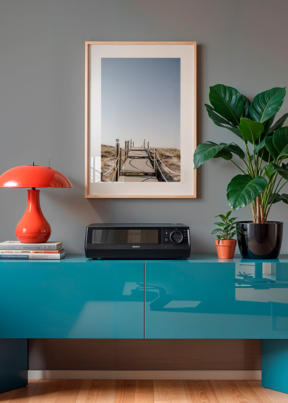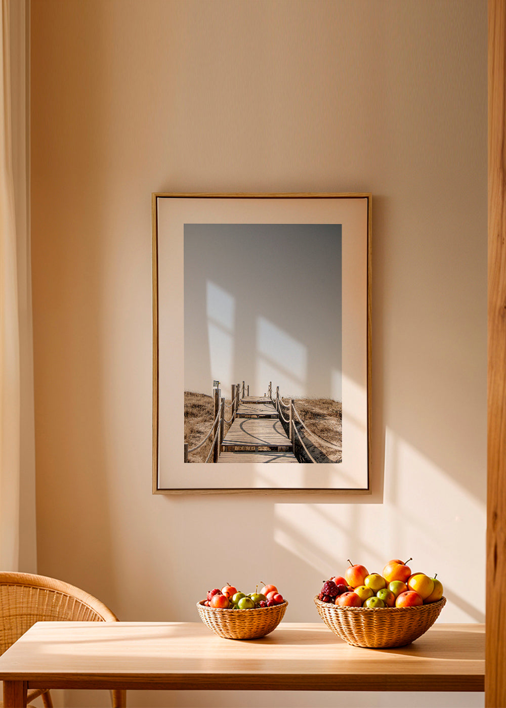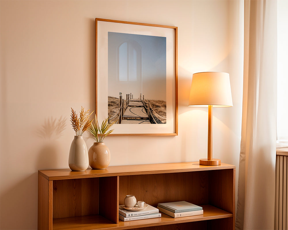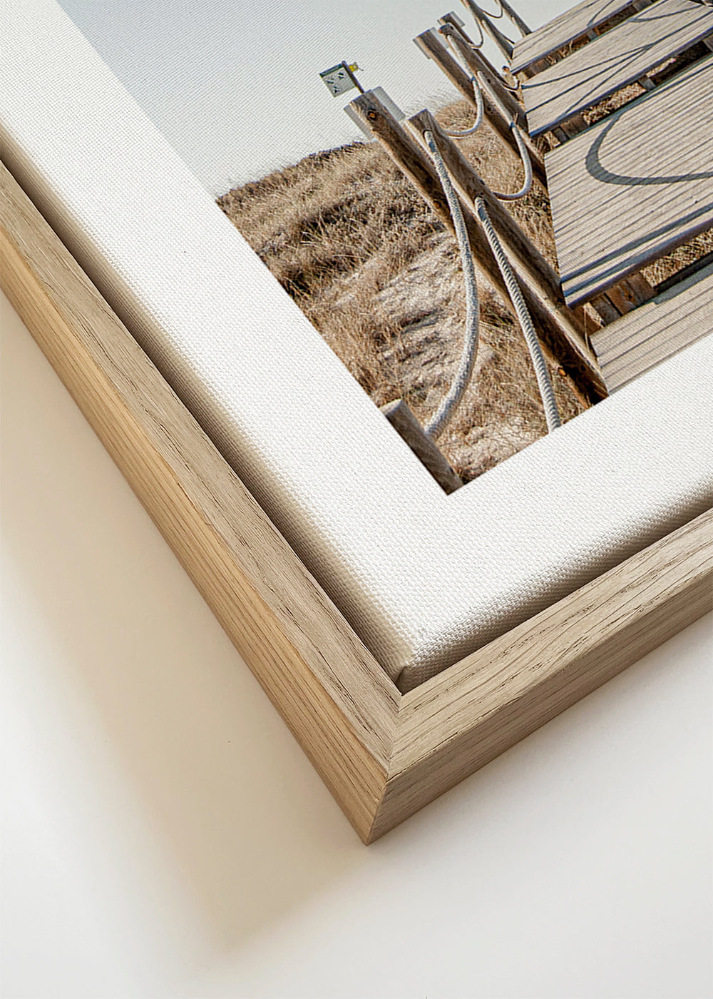 We work with solid wood and aluminium frames. All framed artworks are shipped already assembled and ready to hang. The front protection is made of high-clarity acrylic glass.