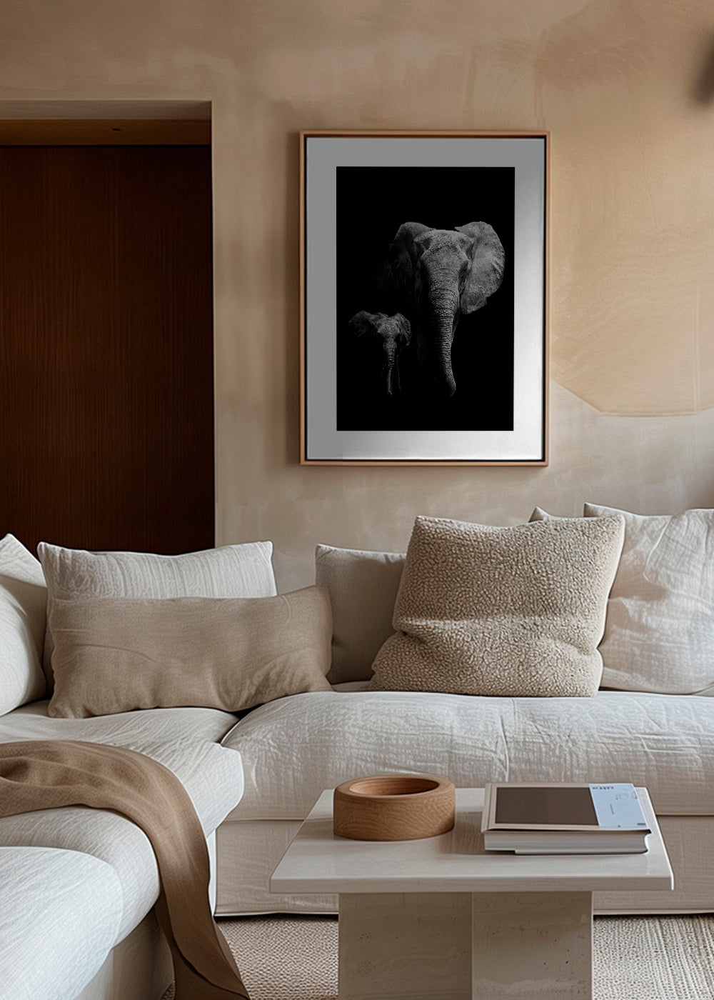 A print from the elephants wall art series, with tones of black and white, and vertical layout. This piece is perfect for animal-lovers. Pair it with other animal pieces for a marvellous composition. Give your decor an artistic touch. This piece includes a white strip framing the design to boost its style.