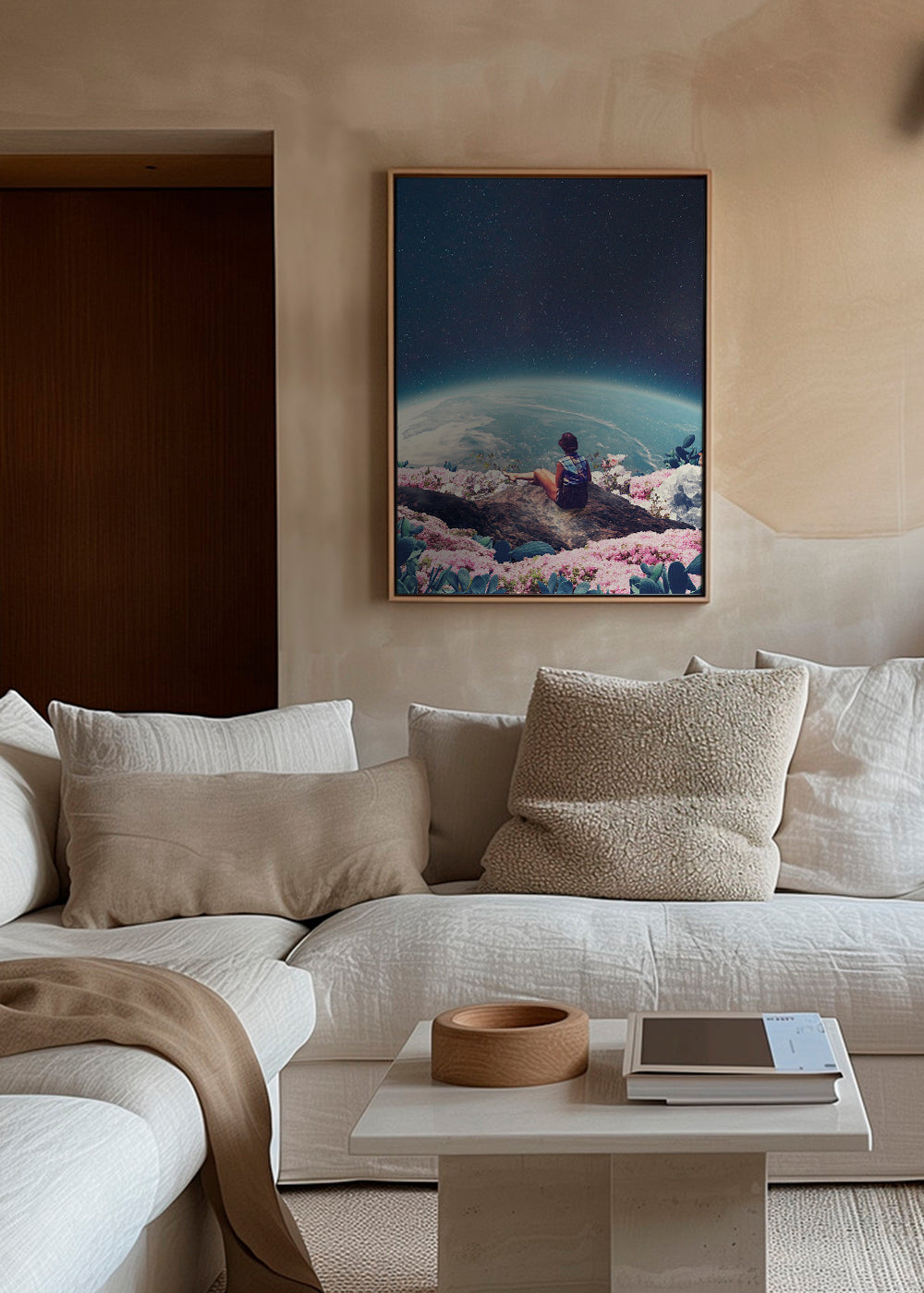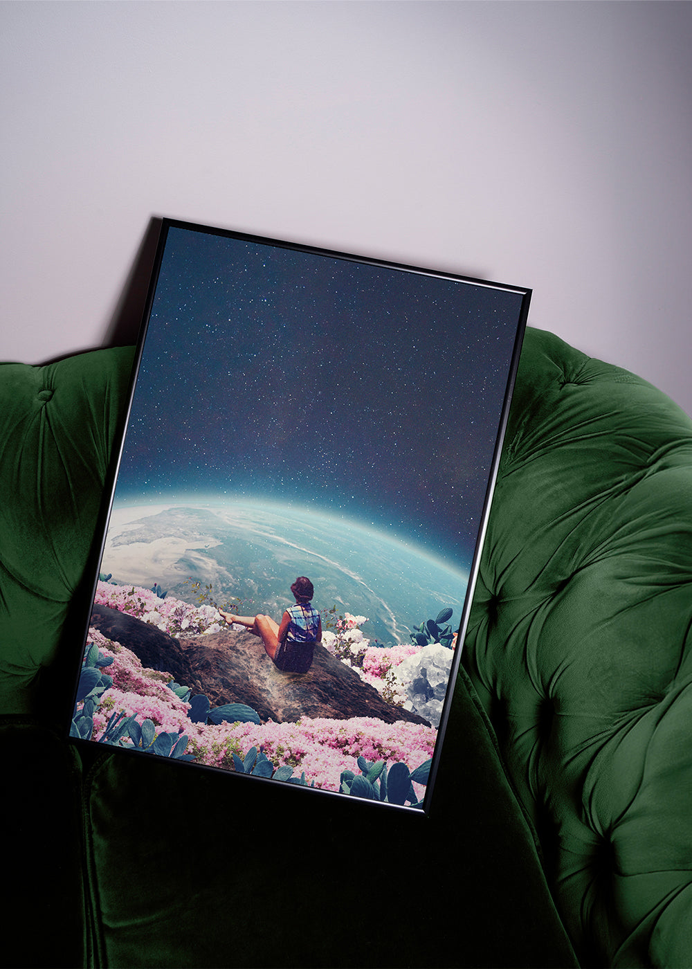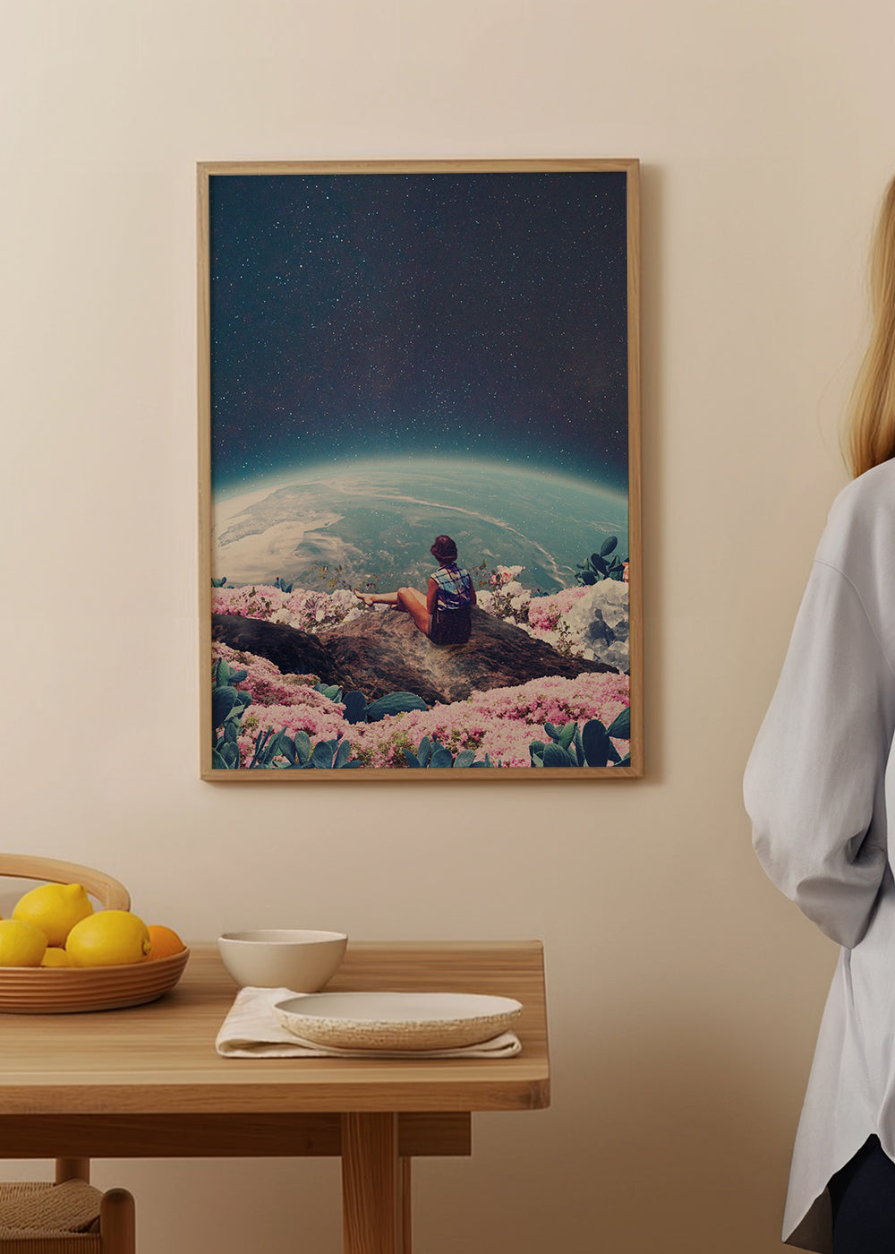 This poster from our repertoire of planet posters, by the artist Frank Moth, with touches of blue, and to hang in vertical position. A retro style that is perfect for a vintage look. An empty wall is a canvas waiting to be painted.