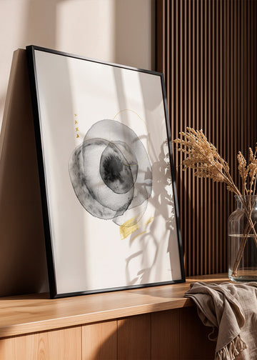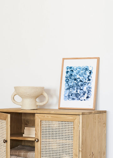 This poster in the style of our geometric wall art and prints, from the collection of the artist Fabiana Silveira, with blue, and facing vertically. This piece with abstract shapes is perfect for pairing with other abstract art and geometric prints. Transform your spaces with art.