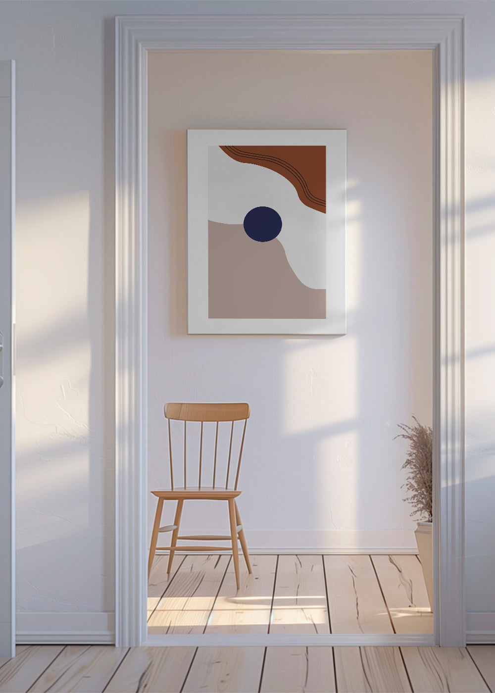 A print from our geometric wall art and prints category, created by Studio Krone Kern, with brown pigments, and to hang in vertical position. The abstract, geometric shapes help create a casual, creative setting. There are no ugly or beautiful walls, just empty or full ones. The white strip around the piece enhances its expressiveness.