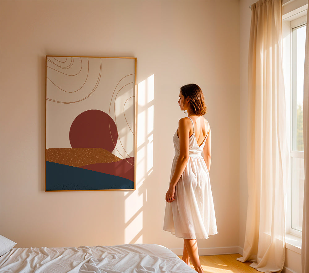 A print from our sunrise and sunset wall art collection, by creative artist Essentially Nomadic, with touches of red, and facing vertically. The tranquillity and freedom of landscape prints is one of a kind. A modern touch for your home.