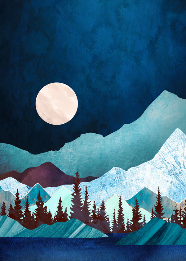 A poster from the mountains wall art series, created by SpaceFrog Designs, with tones of blue, and with vertical layout. Landscape decoration brings a breath of fresh air to any room. Fill your decoration with art.