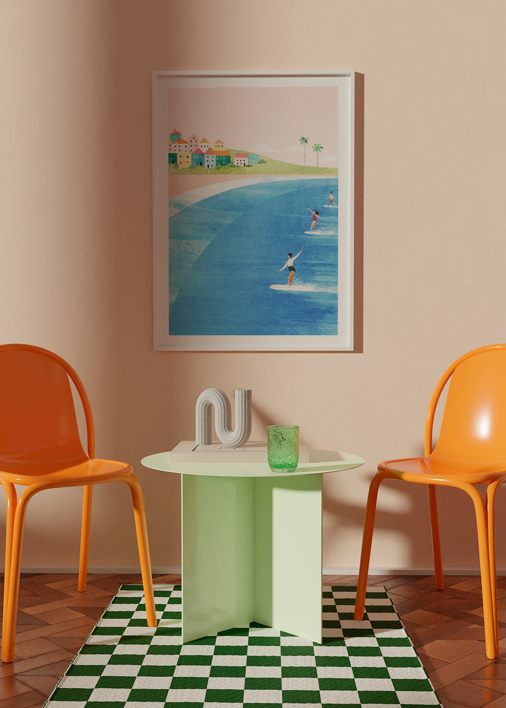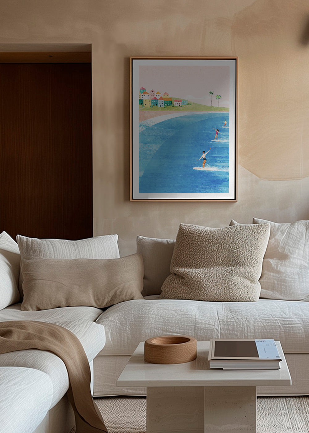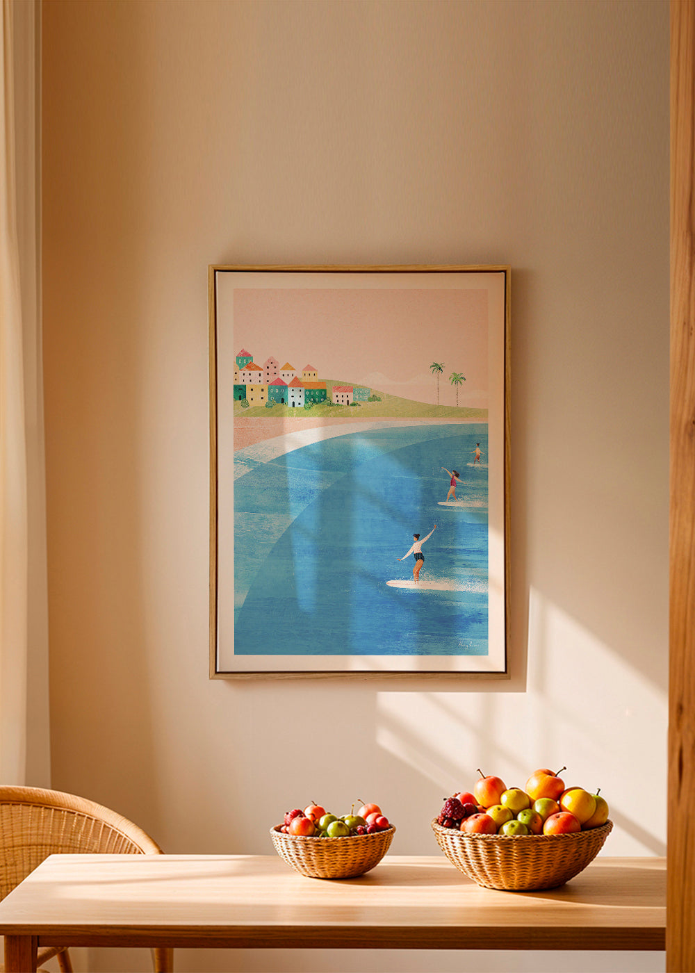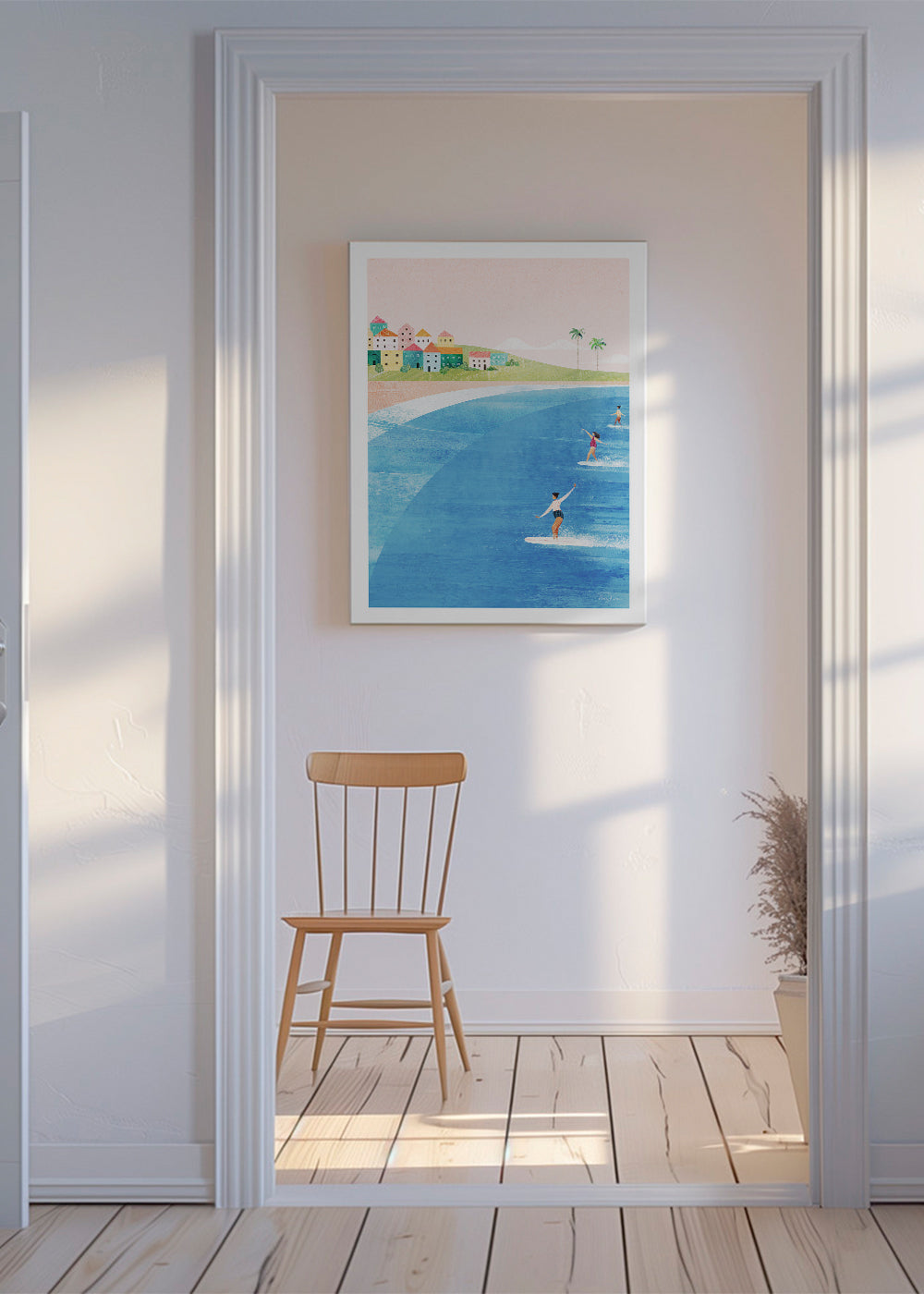 A print from the surf posters and wall art collection, by creative artist Henry Rivers, with tones of blue, and facing vertically. The drawing is simple and clean, so you can pair it with other illustrations for an artistic composition. An empty wall is a sad wall; but with a few prints, we'll make it smile.