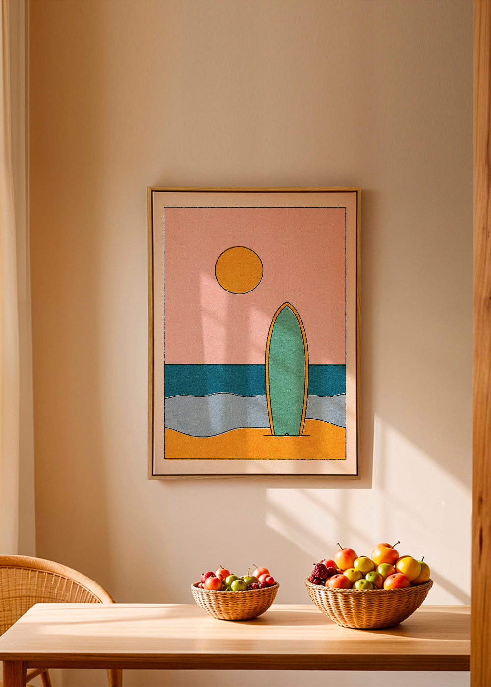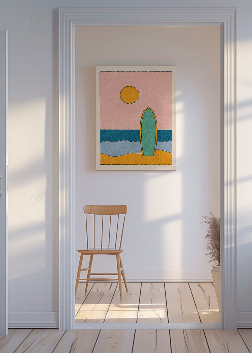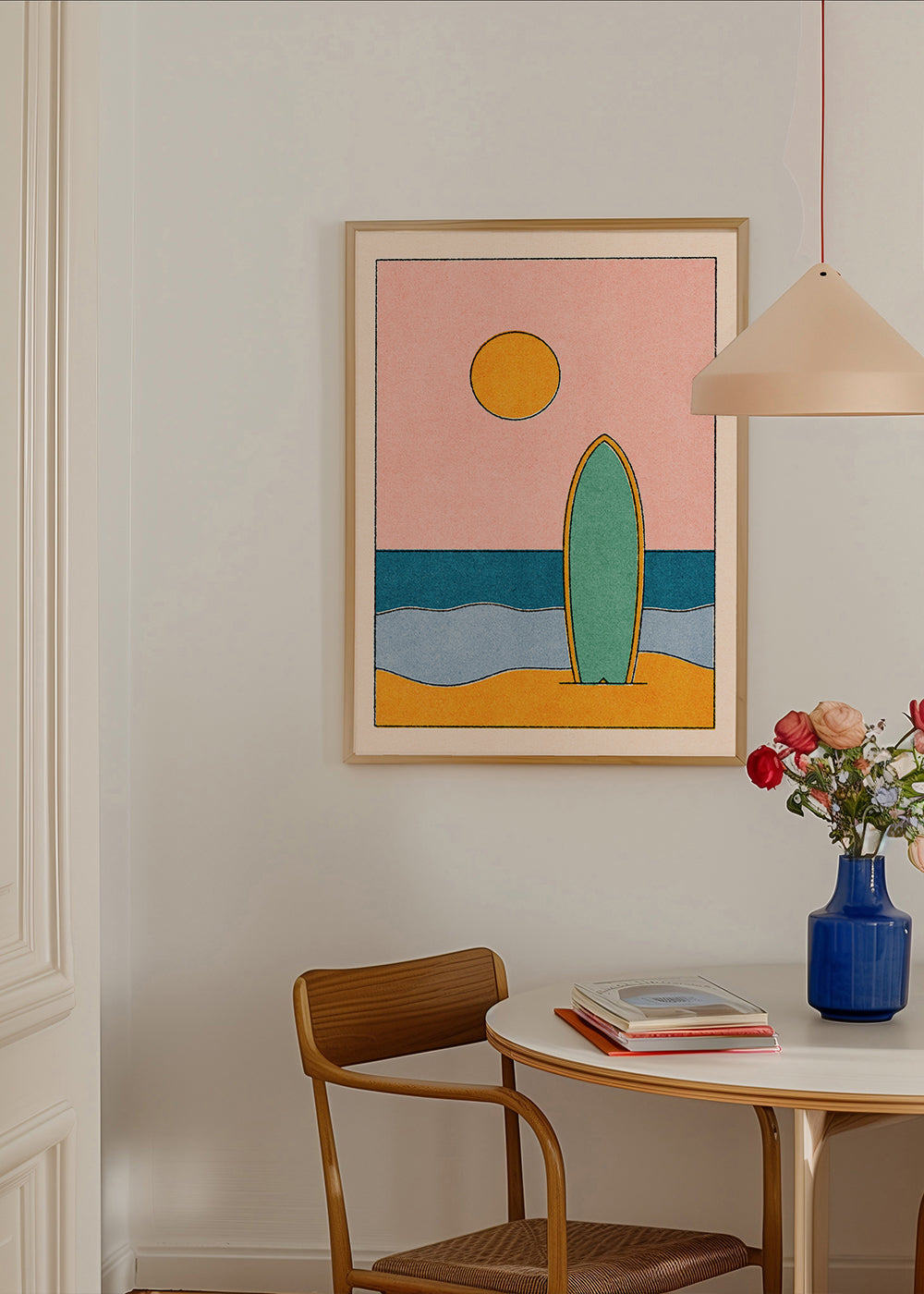 Beautiful design in the style of our surf posters and wall art, created by Daniel Coulmann, with multicolor pigments, and with vertical layout. Illustrated posters are perfect for pairing with minimalist and abstract art. An empty wall is a canvas waiting to be painted.