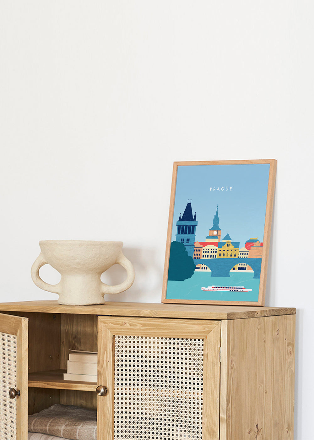 A design from the travel posters series, made by Katinka Reinke, with blue pigments, and vertical layout. Combine skylines, photos and city maps to create a composition for those with wanderlust. Fill your walls with art.