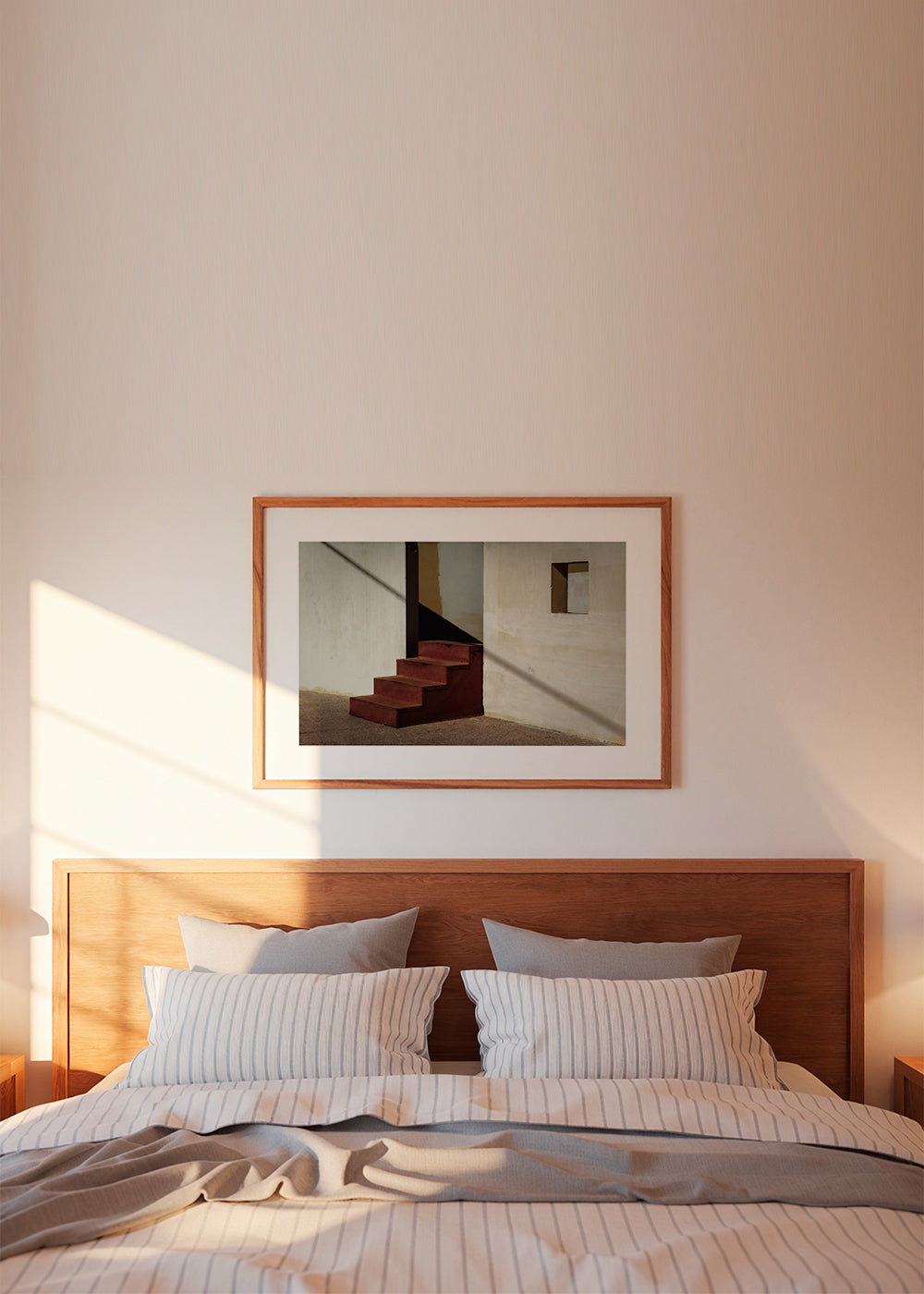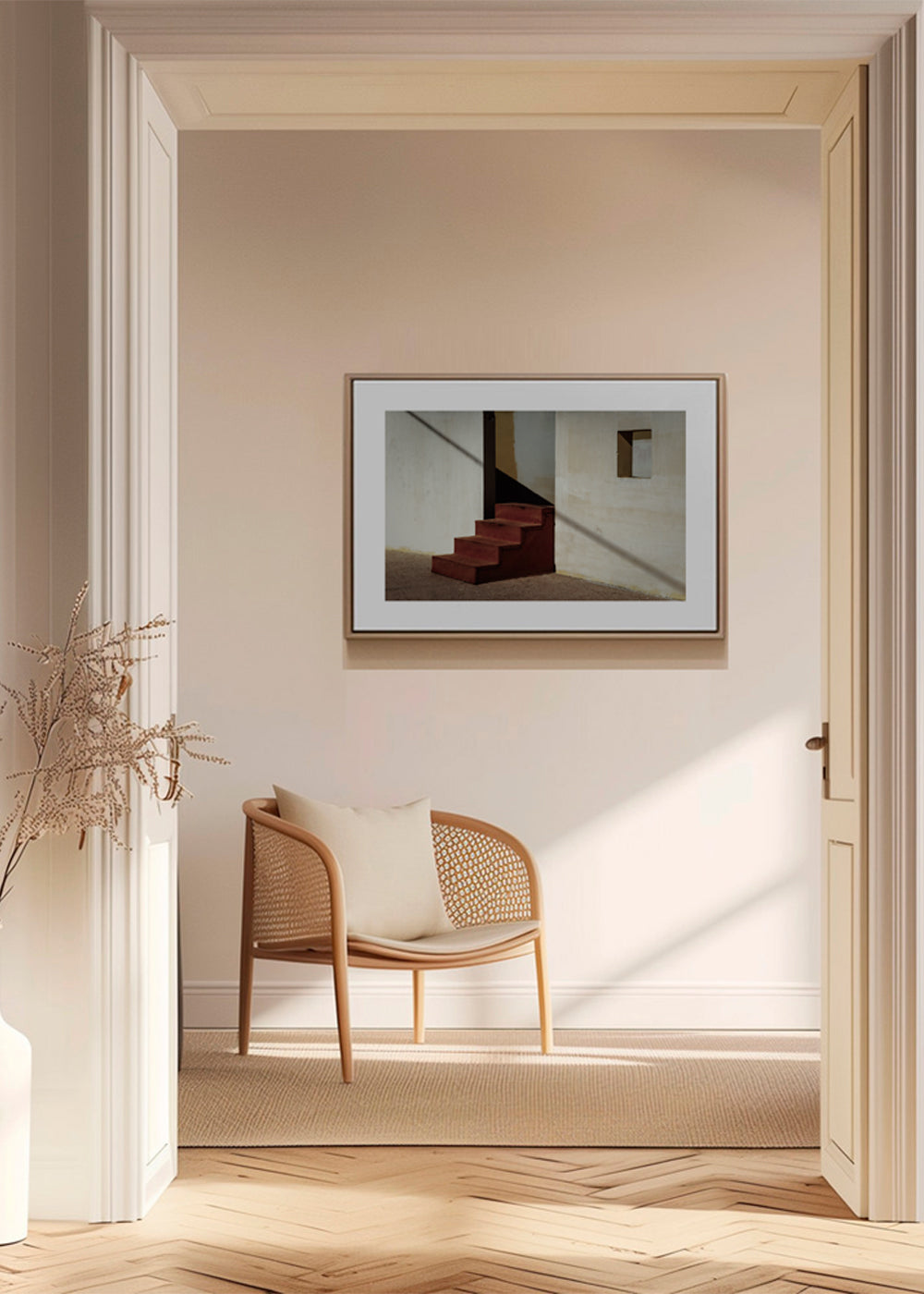 A piece from our repertoire of architecture wall art and prints, with red pigments, and in horizontal position. Artistic photos bring expressiveness to home decor. Elegance inspired by art. This design includes a white strip around it to add contrast to the piece.