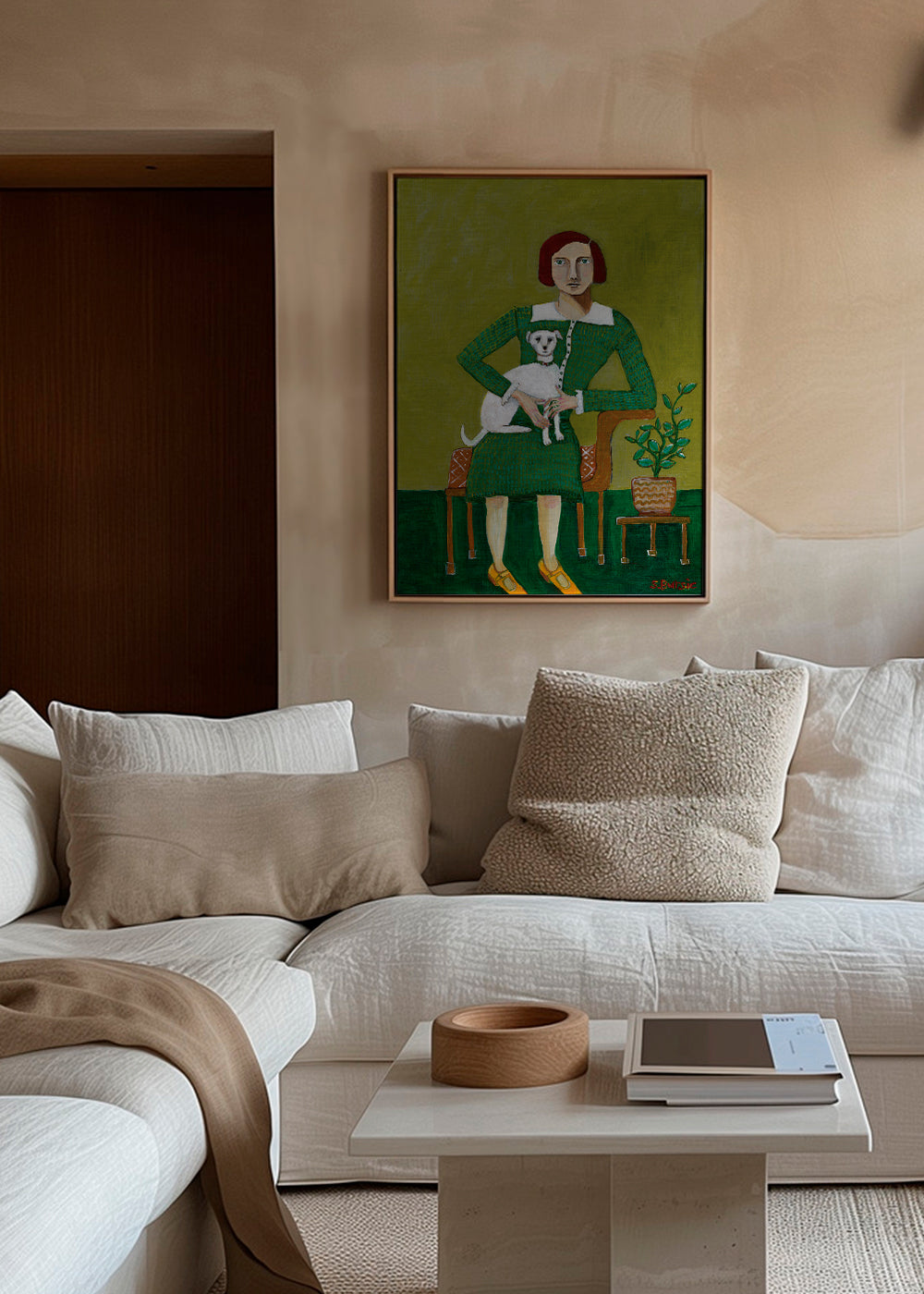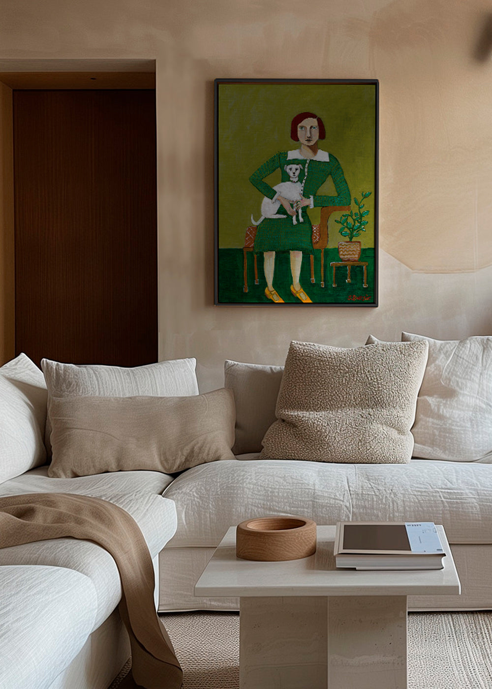 Scandinavian wall art Vintage Lady with her white dog - Sharyn Bursic