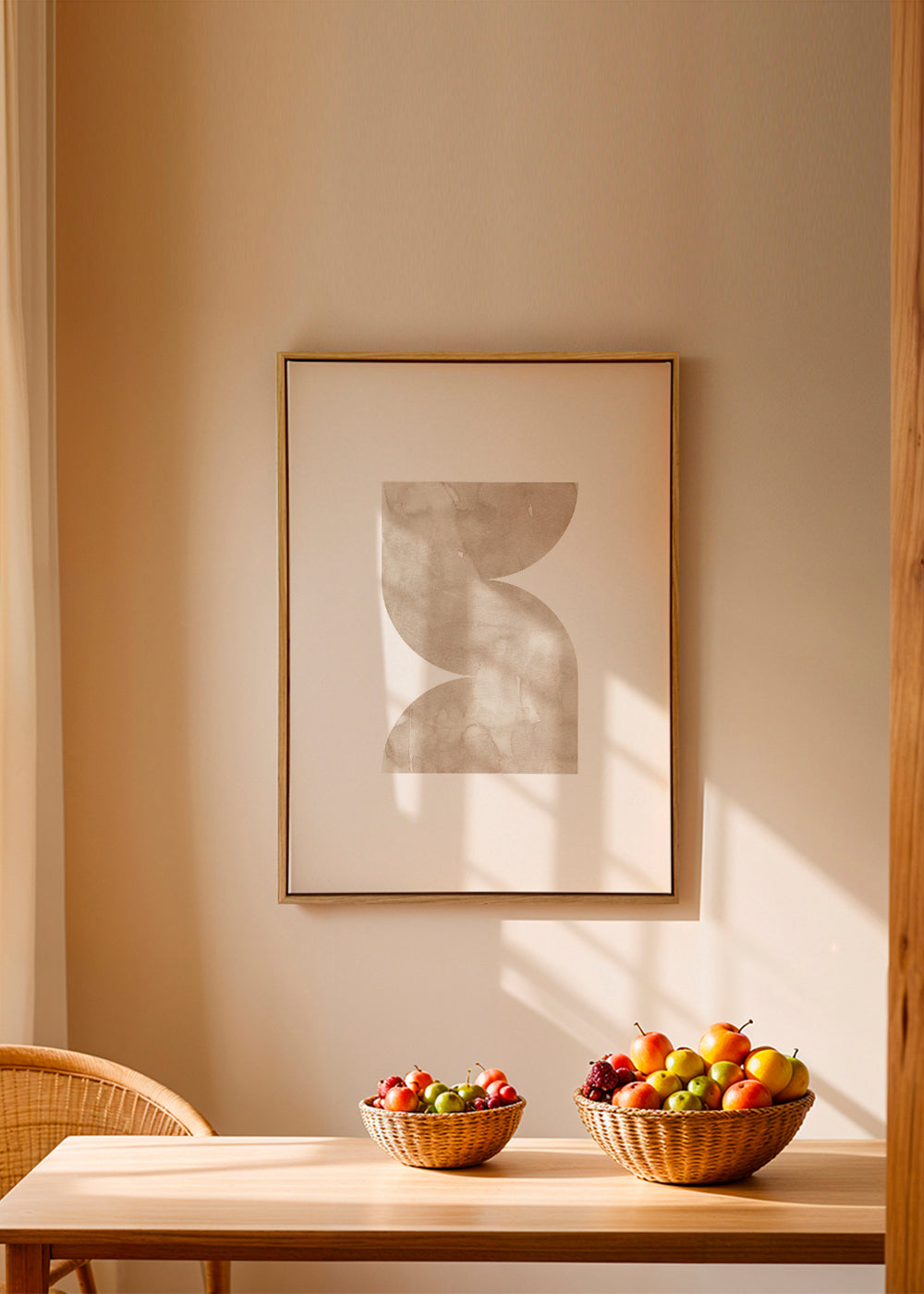 A design from our geometric wall art and prints collection, from the Noveau Prints collection, in tones of beige, and to hang in vertical position. The abstract, geometric shapes help create a casual, creative setting. Create spots full of art.