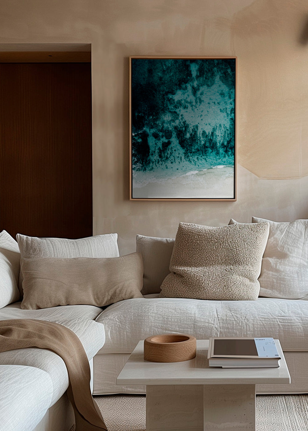 A print inspired by the collection of beach wall art, by Chris Abatzis, with touches of blue, and with vertical layout. Landscape prints are spectacular; pair them with texts and phrases to create cool wall compositions. Let art flood your home.