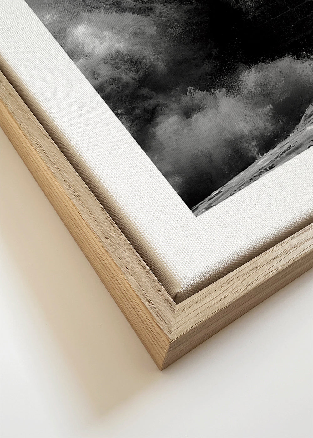 We work with solid wood and aluminium frames. All framed artworks are shipped already assembled and ready to hang. The front protection is made of high-clarity acrylic glass.