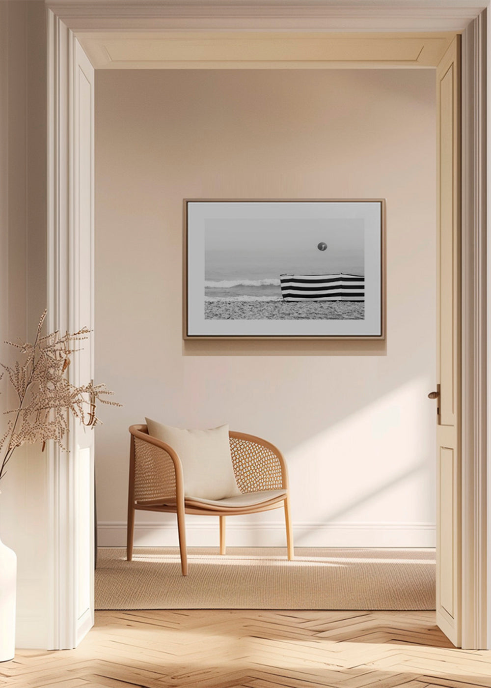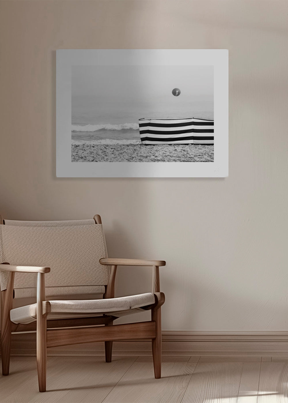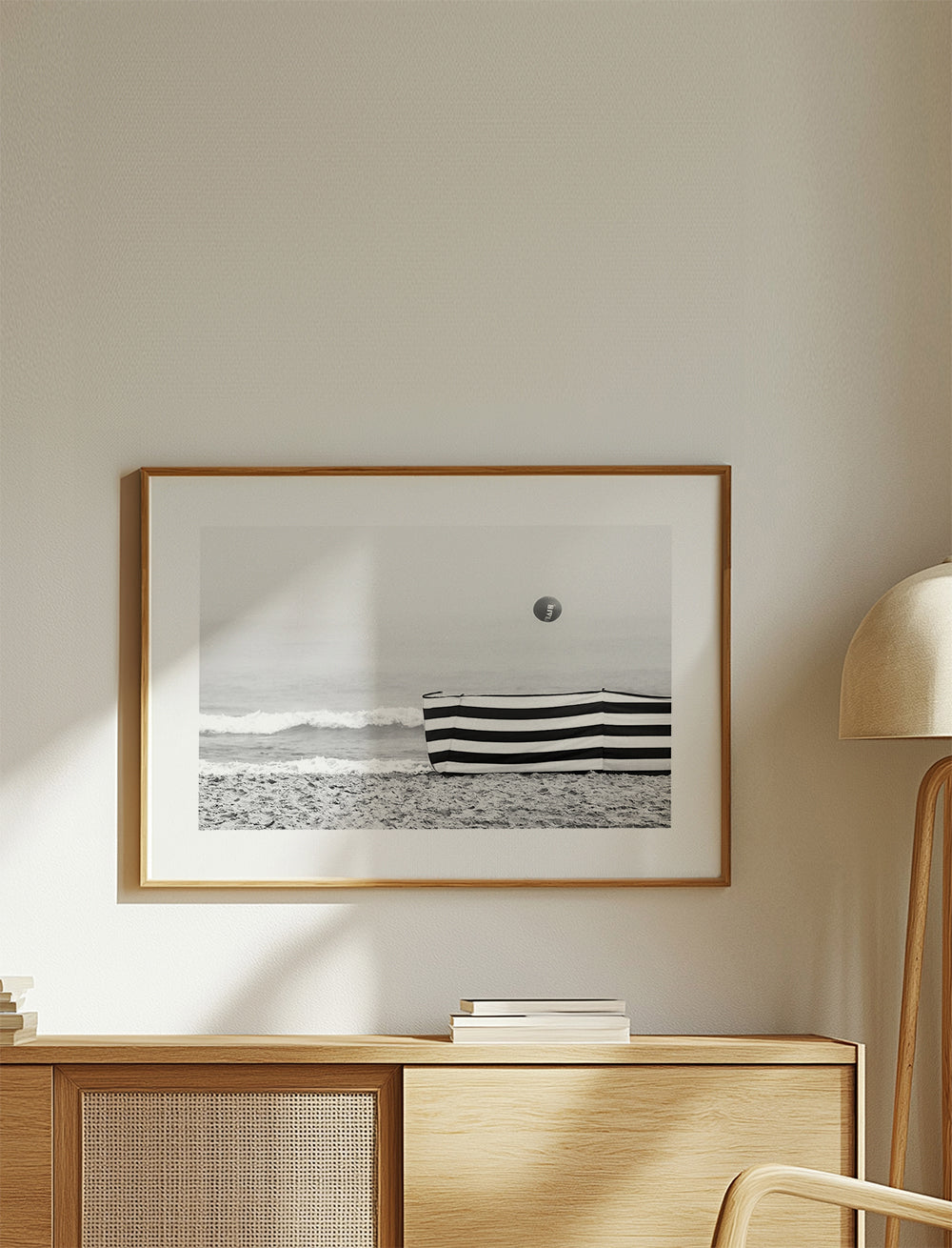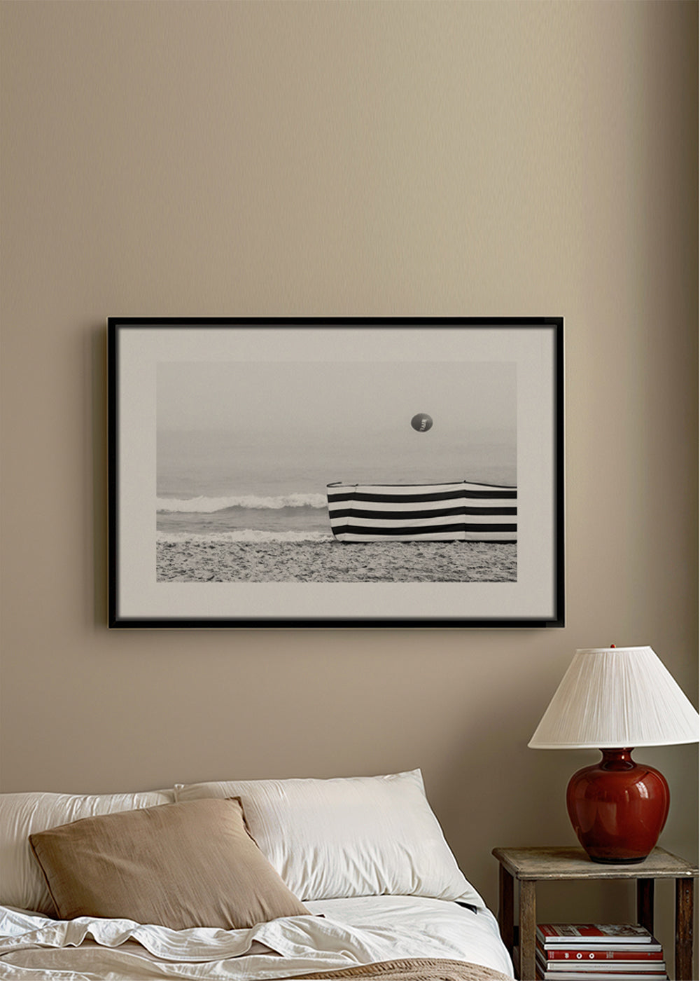 A print in the style of our beach wall art, in tones of black, and in horizontal position. A beautiful landscape perfect for pairing with other nature prints. Transform your spaces with art. This design includes a white strip around it to add contrast to the piece.